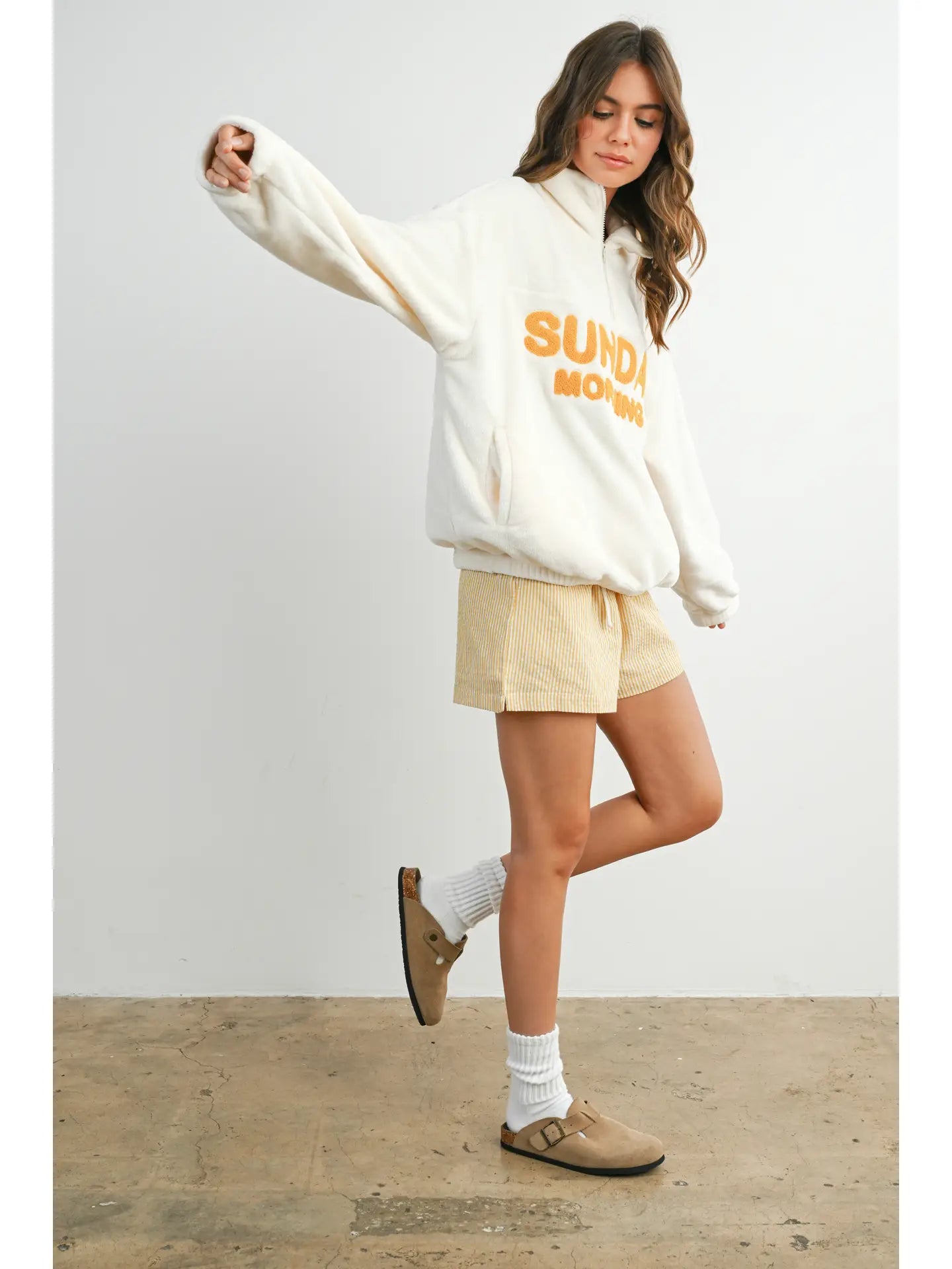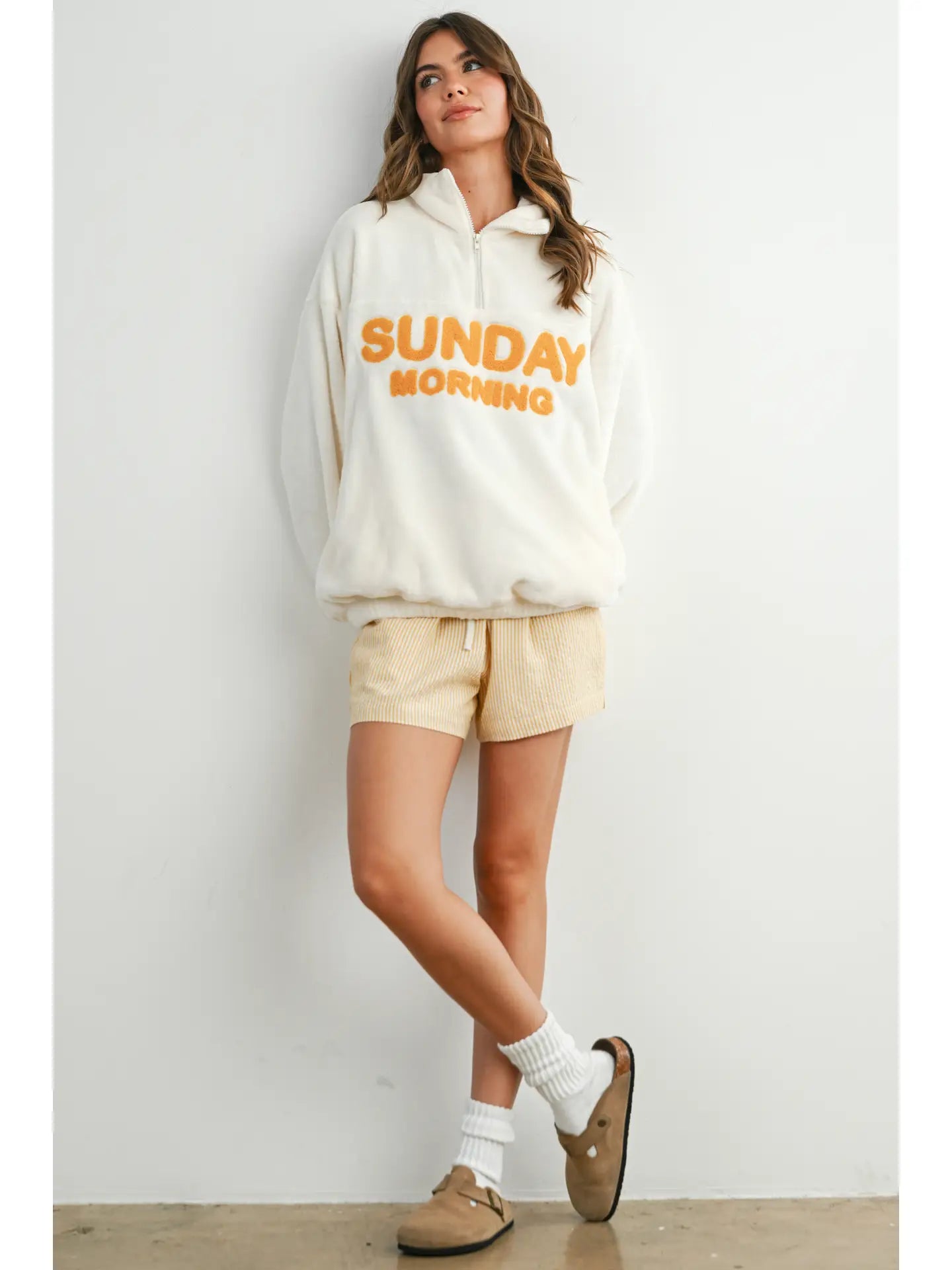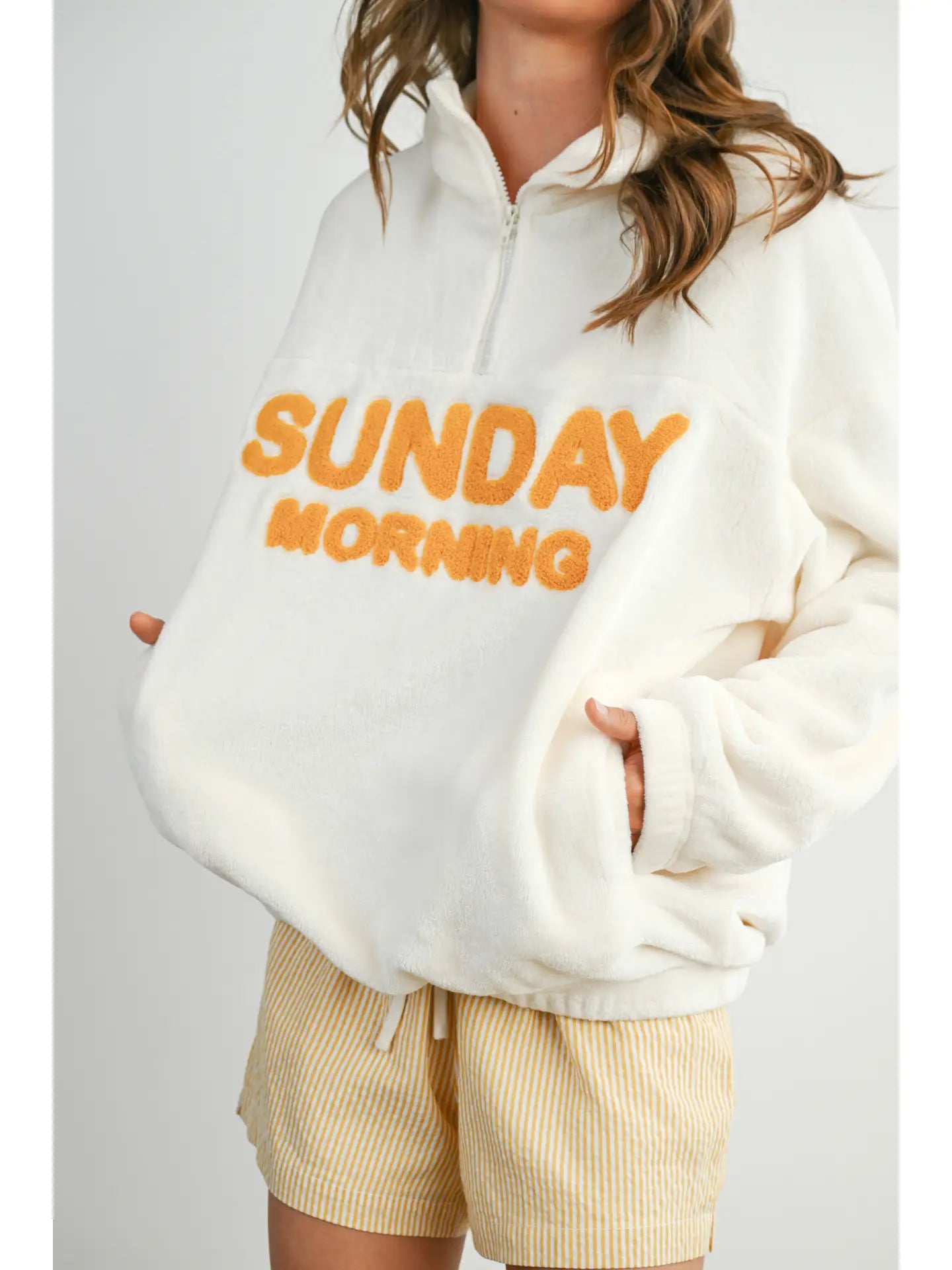 Introducing the Sunday Morning Half-Zip Pullover Sweatshirt - the perfect blend of comfort and style for those casual, laid-back mornings. Made from soft, breathable fabric, this half-zip pullover is designed to keep you cozy without sacrificing mobility. The relaxed fit makes it easy to layer, while the half-zip design adds a touch of versatility and convenience. Whether you're heading out for a morning stroll or lounging at home, this jacket is a must-have for effortless weekend wear.