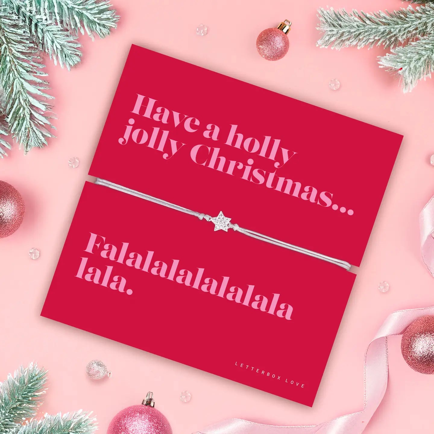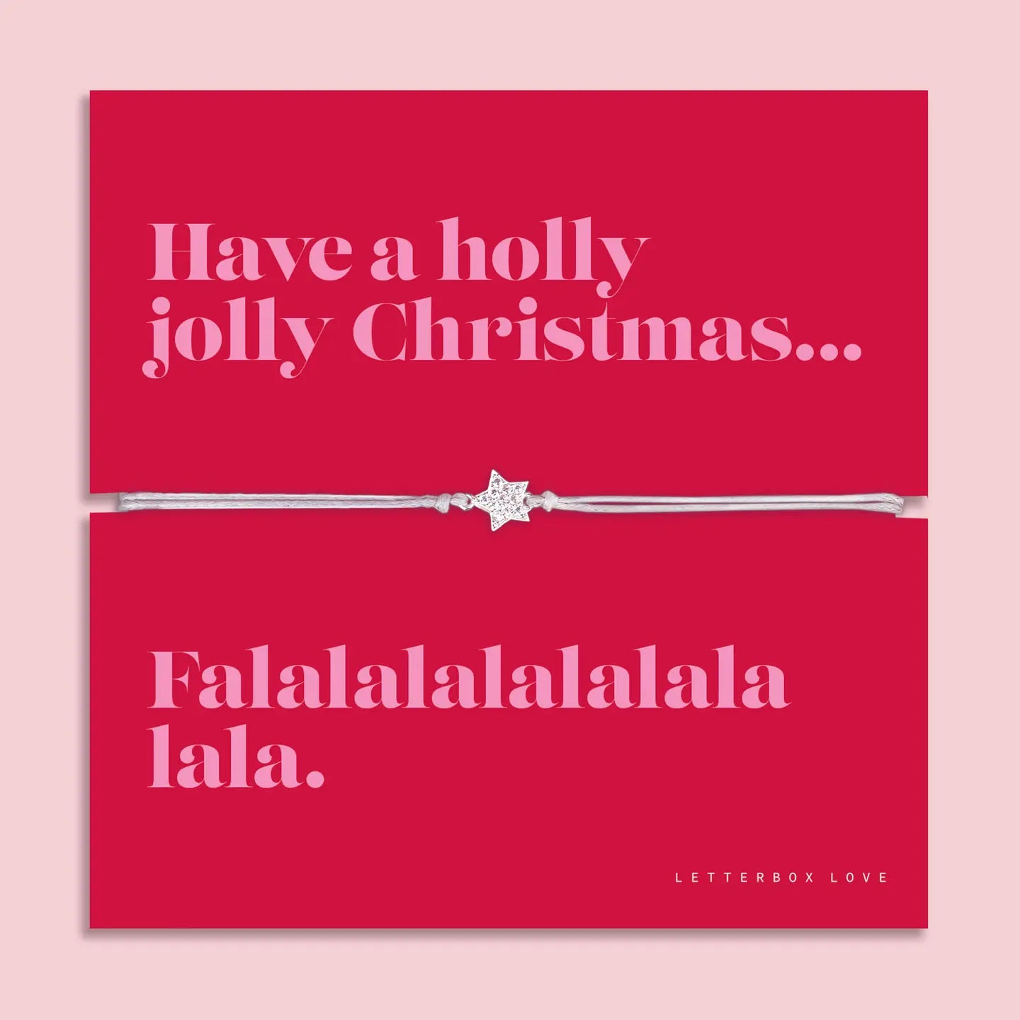 Bring a sparkle of festive fun to your wrist with our Holly Jolly Christmas bracele. Featuring a shimmering silver-tone star charm on a soft grey cord, this merry little bracelet is mounted on a bold red card with the cheerful phrase: “Have a holly jolly Christmas… Falalalalalalalalalala.”