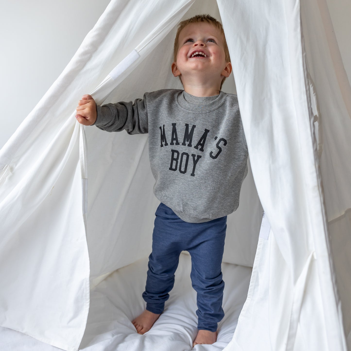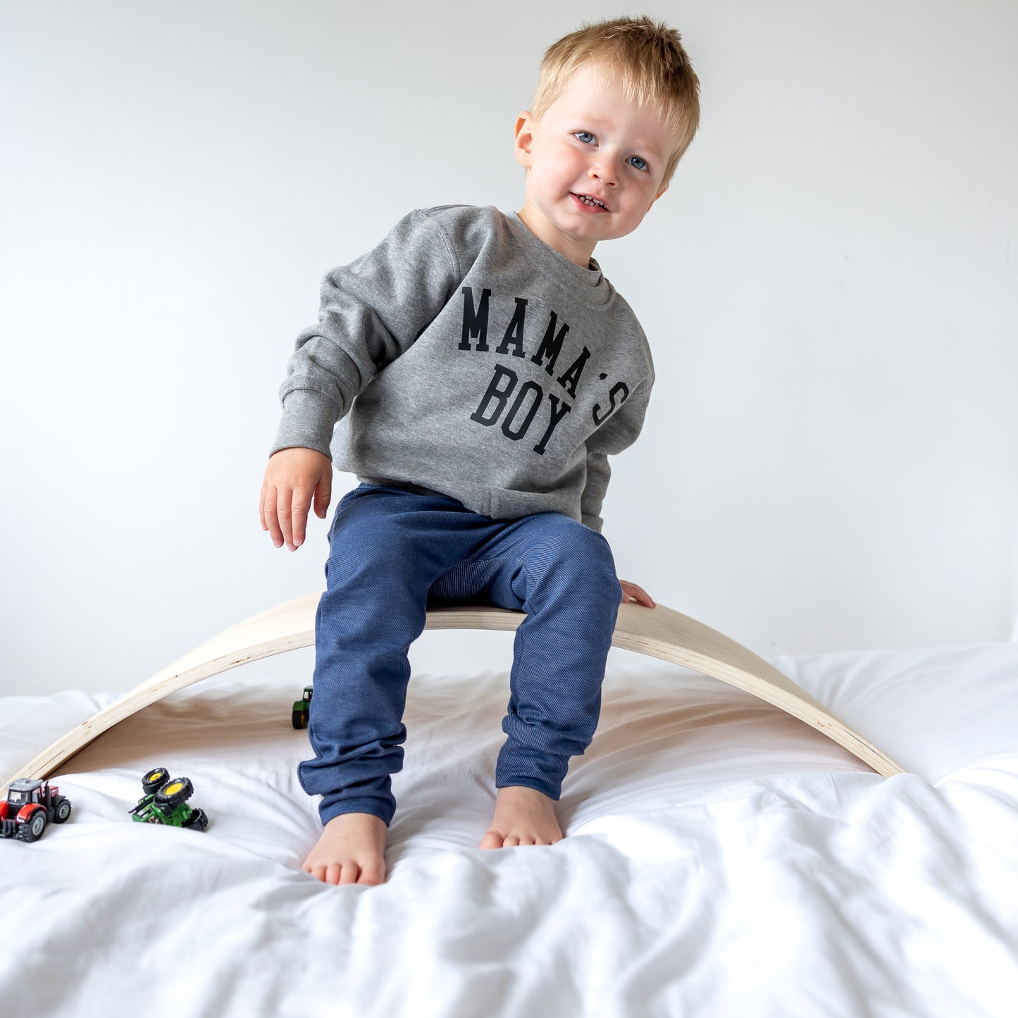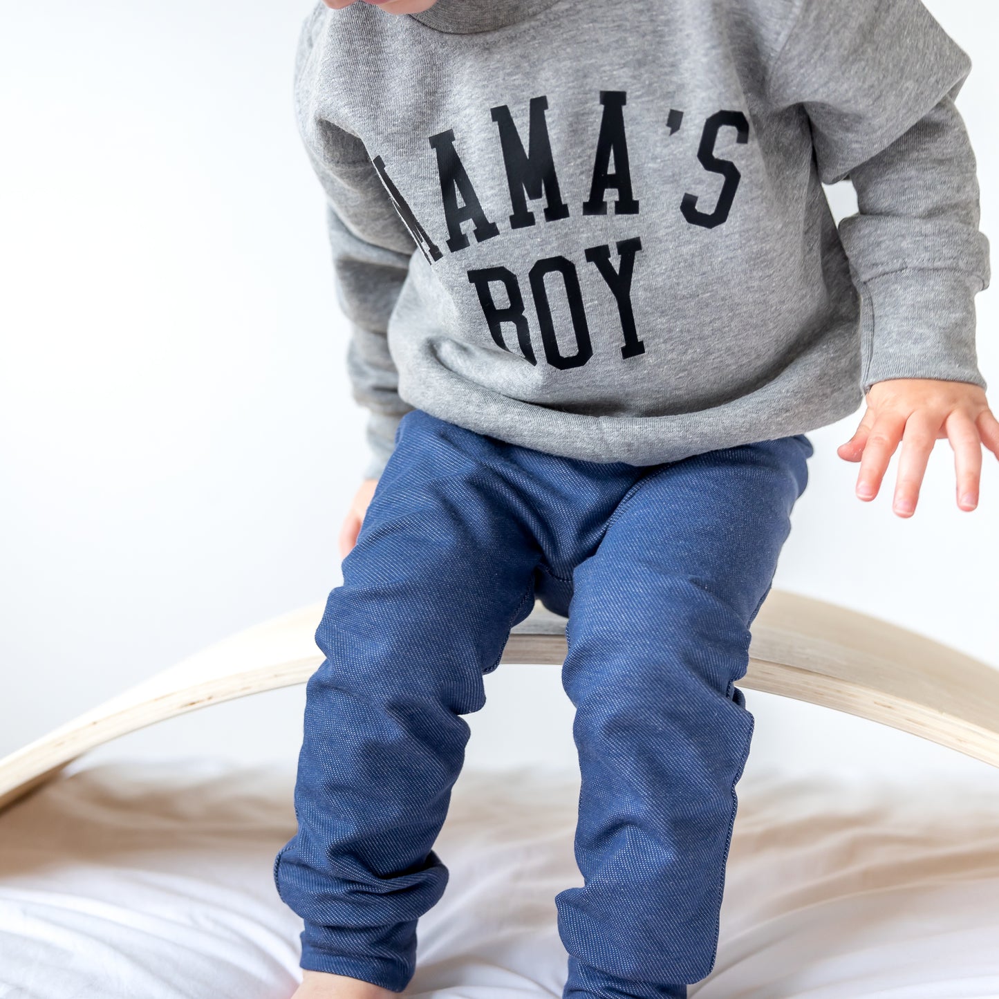 Our Grey Mamas boy sweater is finished by hand by us here in our Essex studio