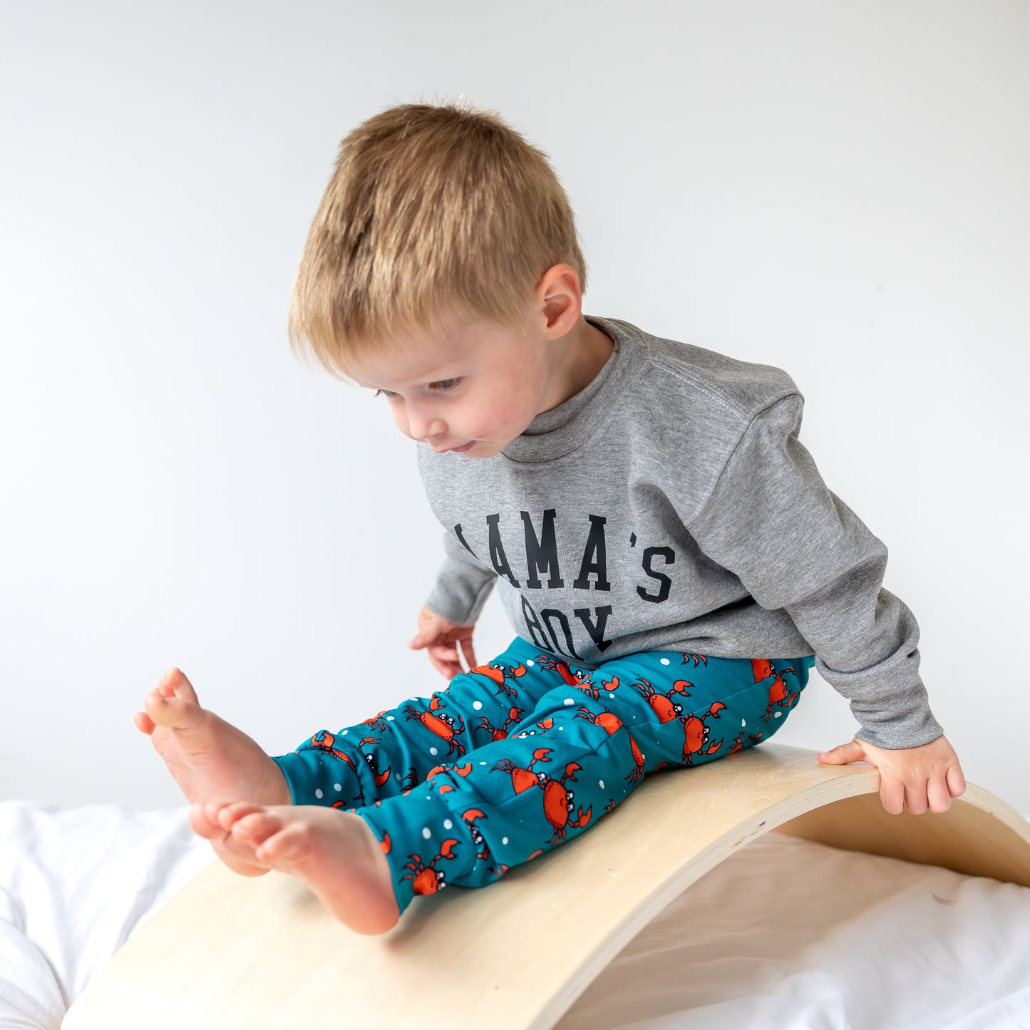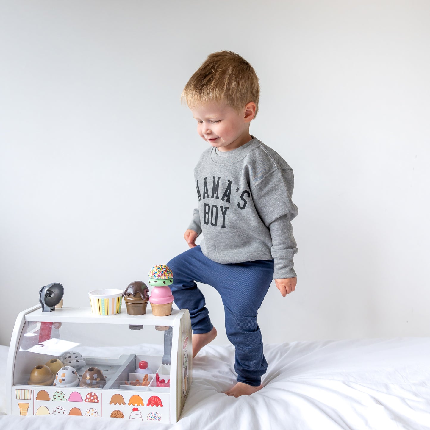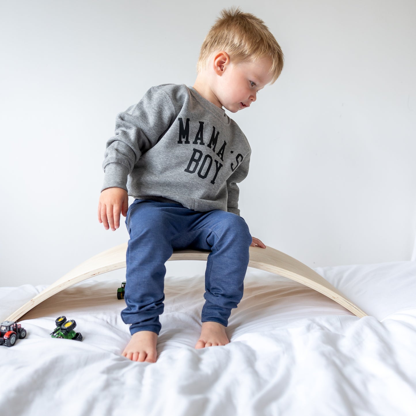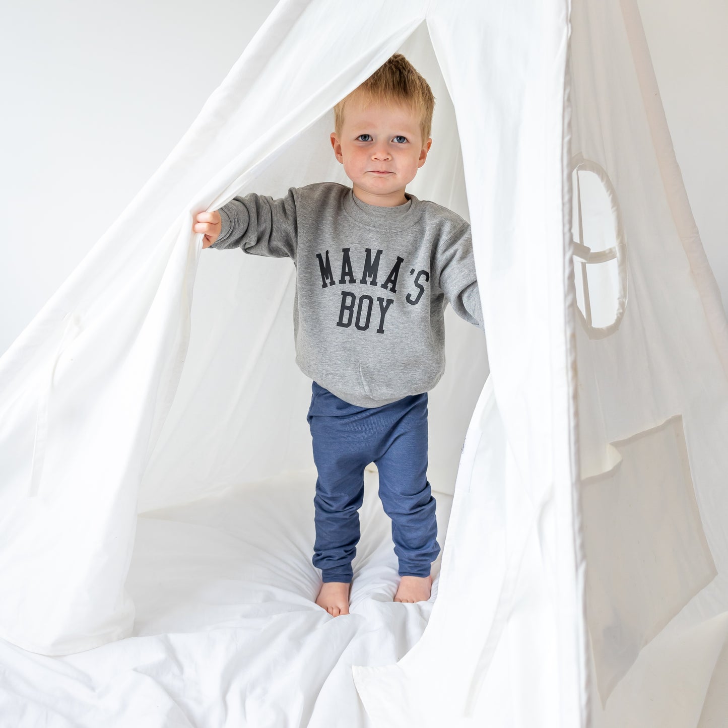 Our Grey Mamas boy sweater is finished by hand by us here in our Essex studio
