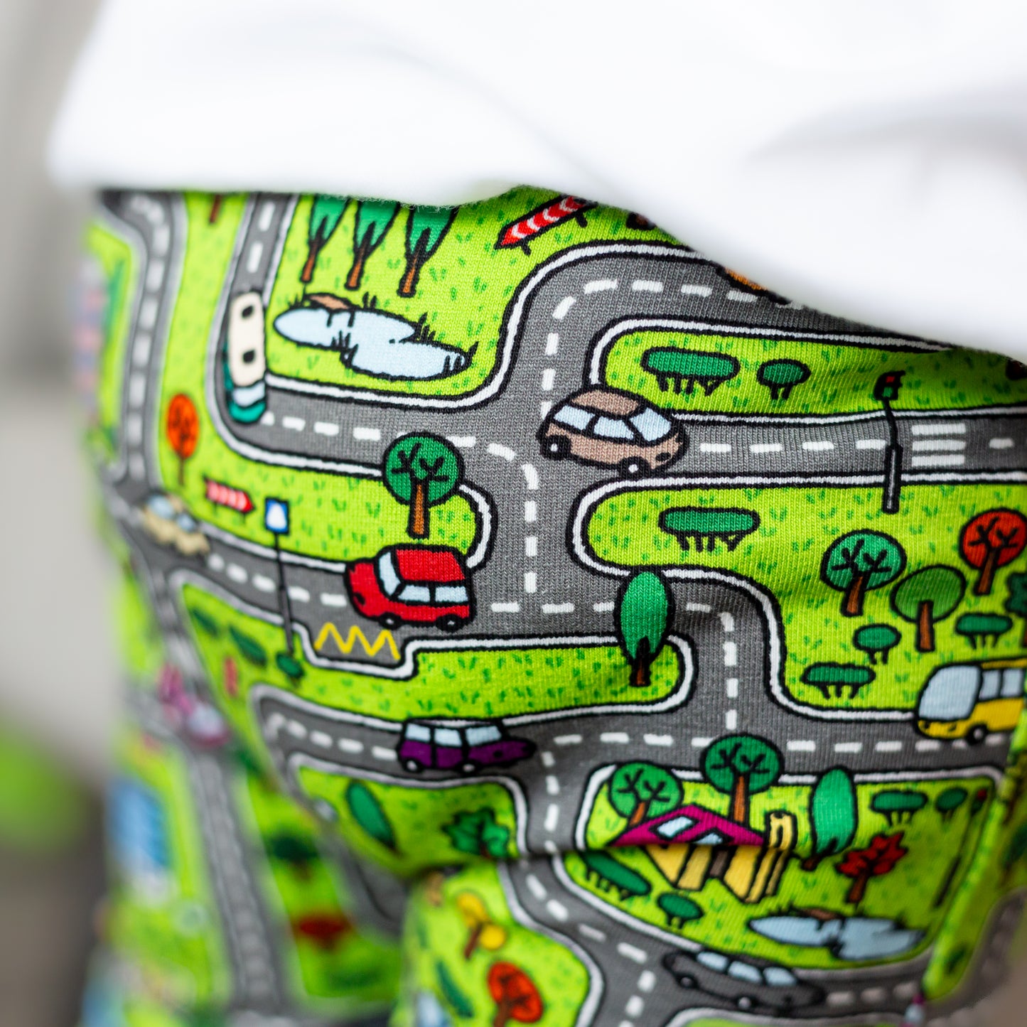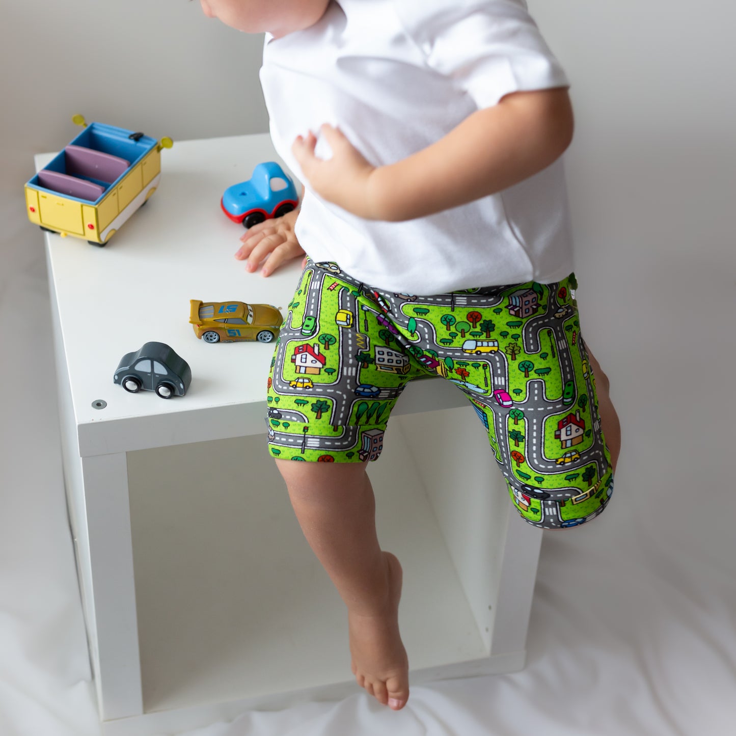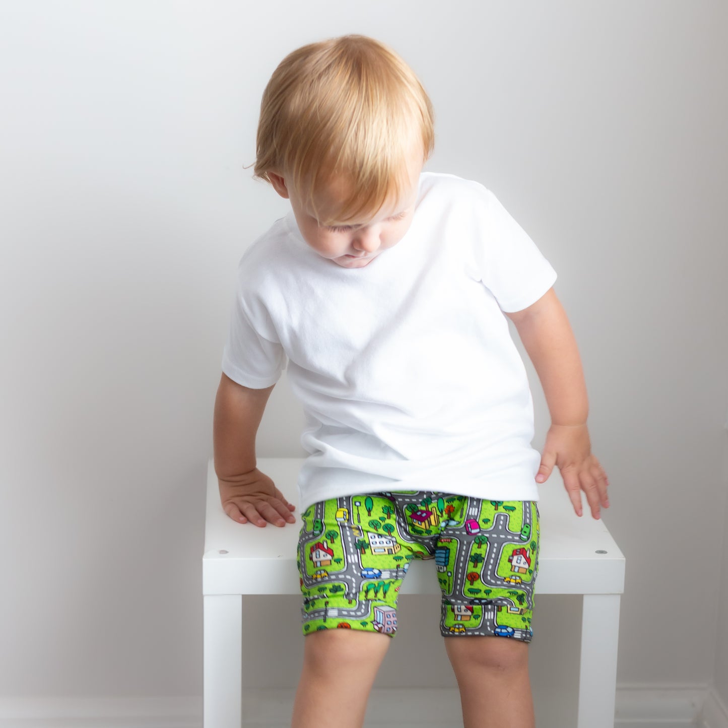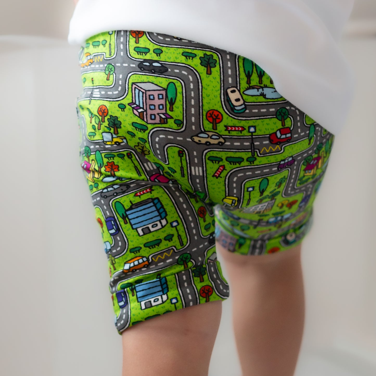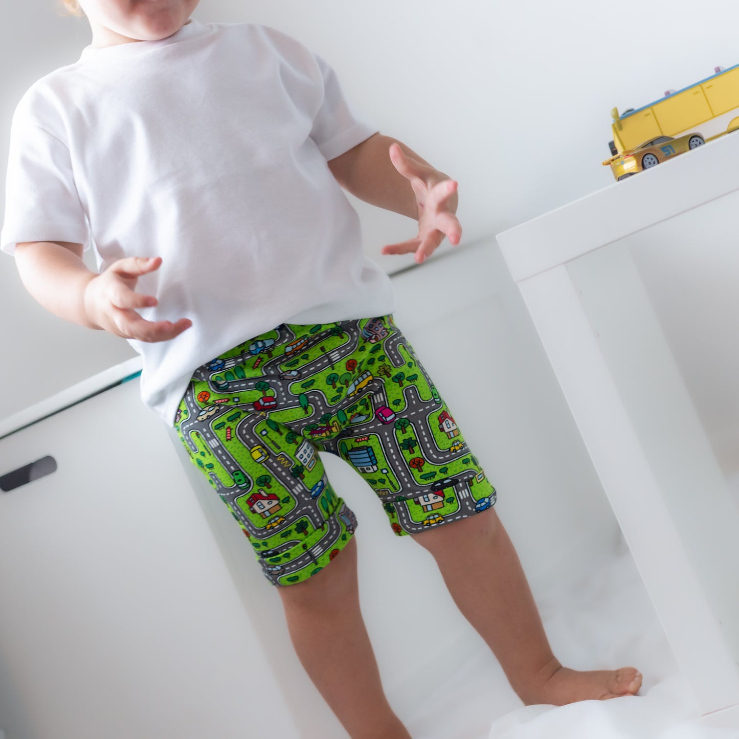 Our Play Map Shorts are made in the UK from 95% Cotton 5 % Elastane Jersey.