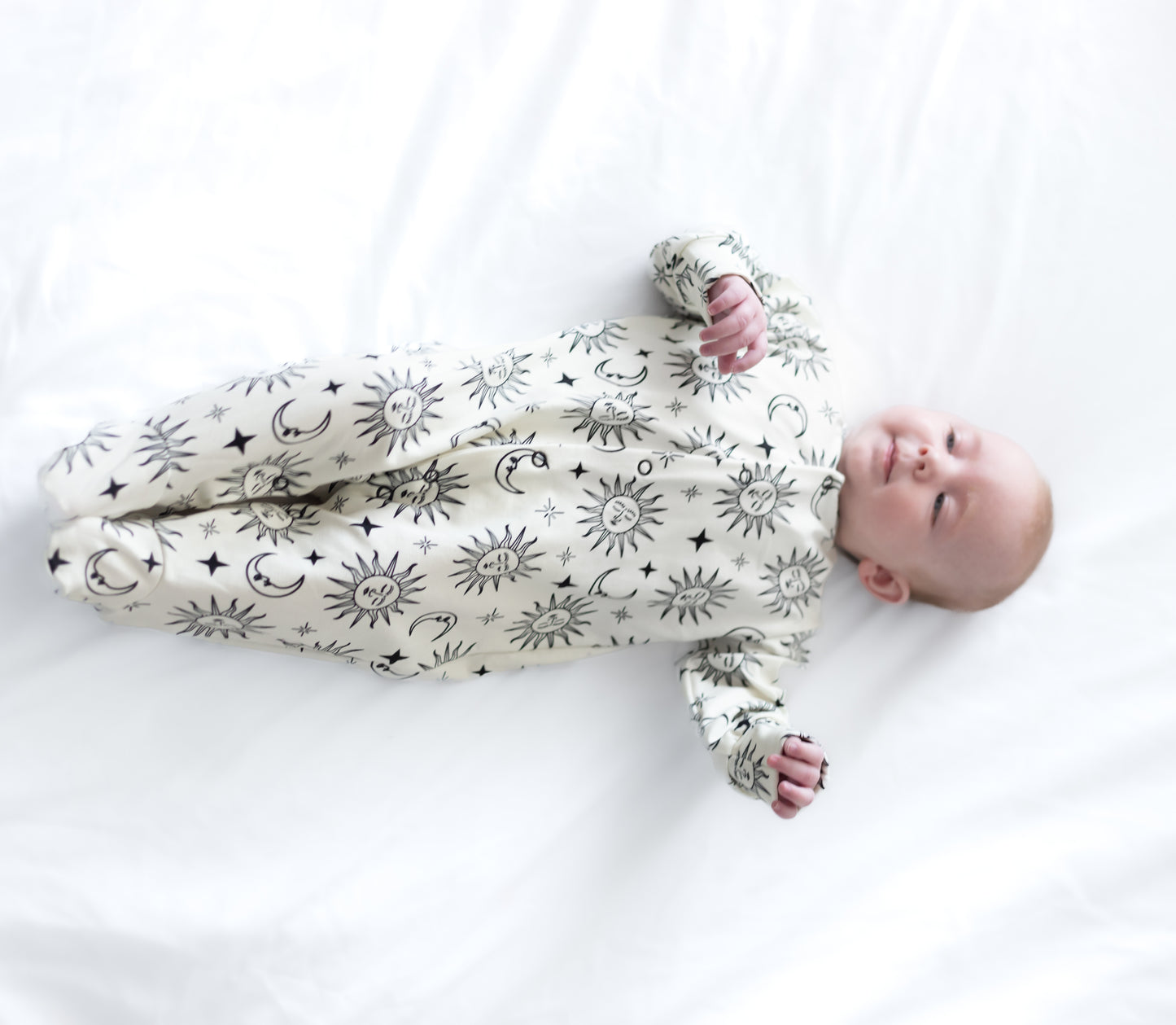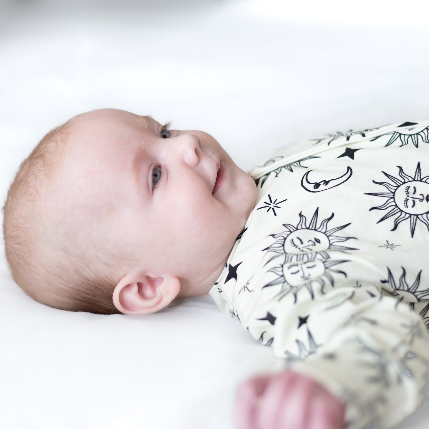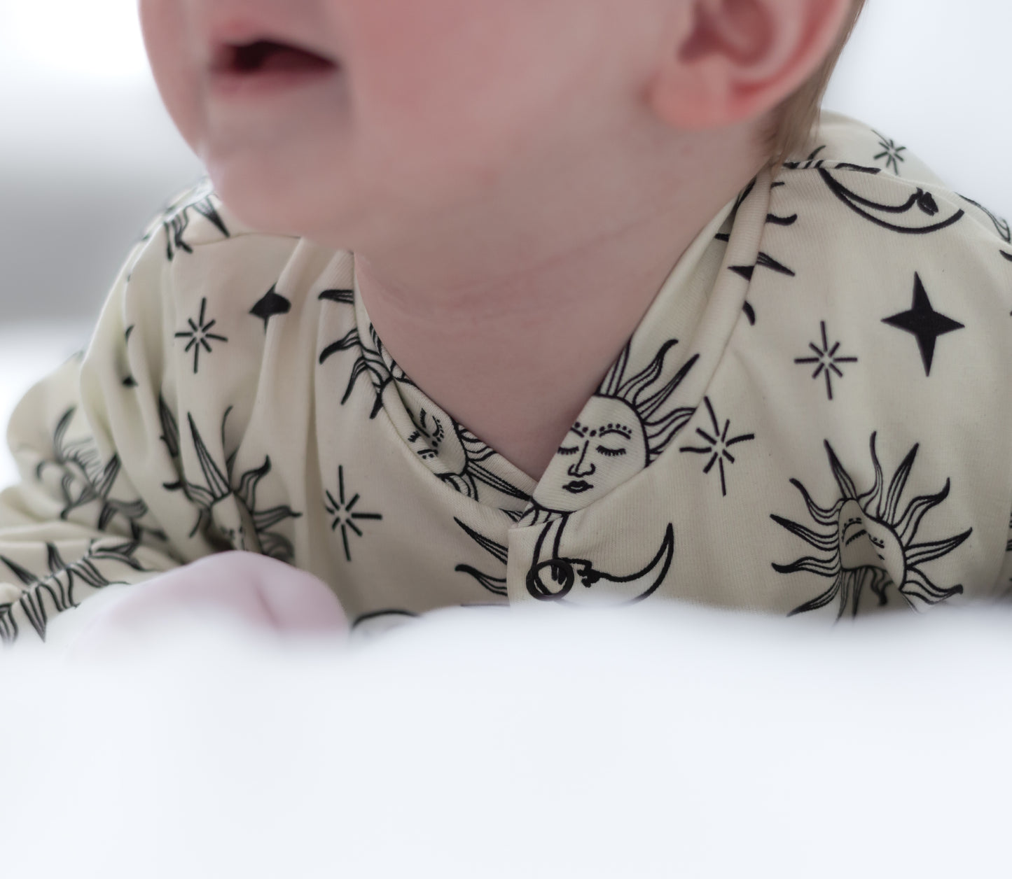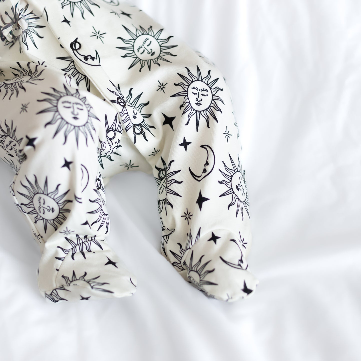 Our new and gorgeous Sun & Moon print sleep suit is the perfect one-piece for any baby.