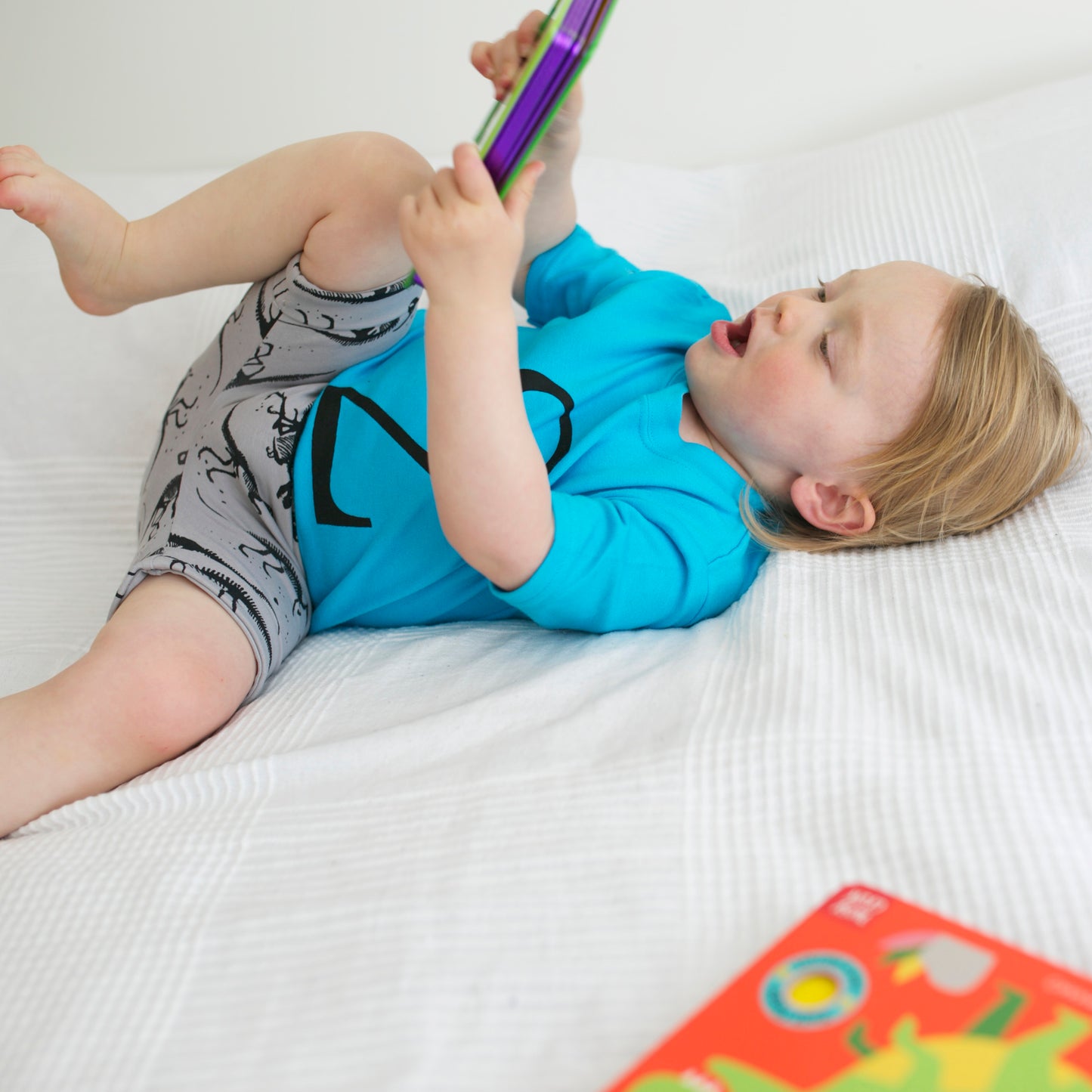 Our Grey dino Shorts are made in the UK from 95% Cotton 5 % Elastane Jersey.