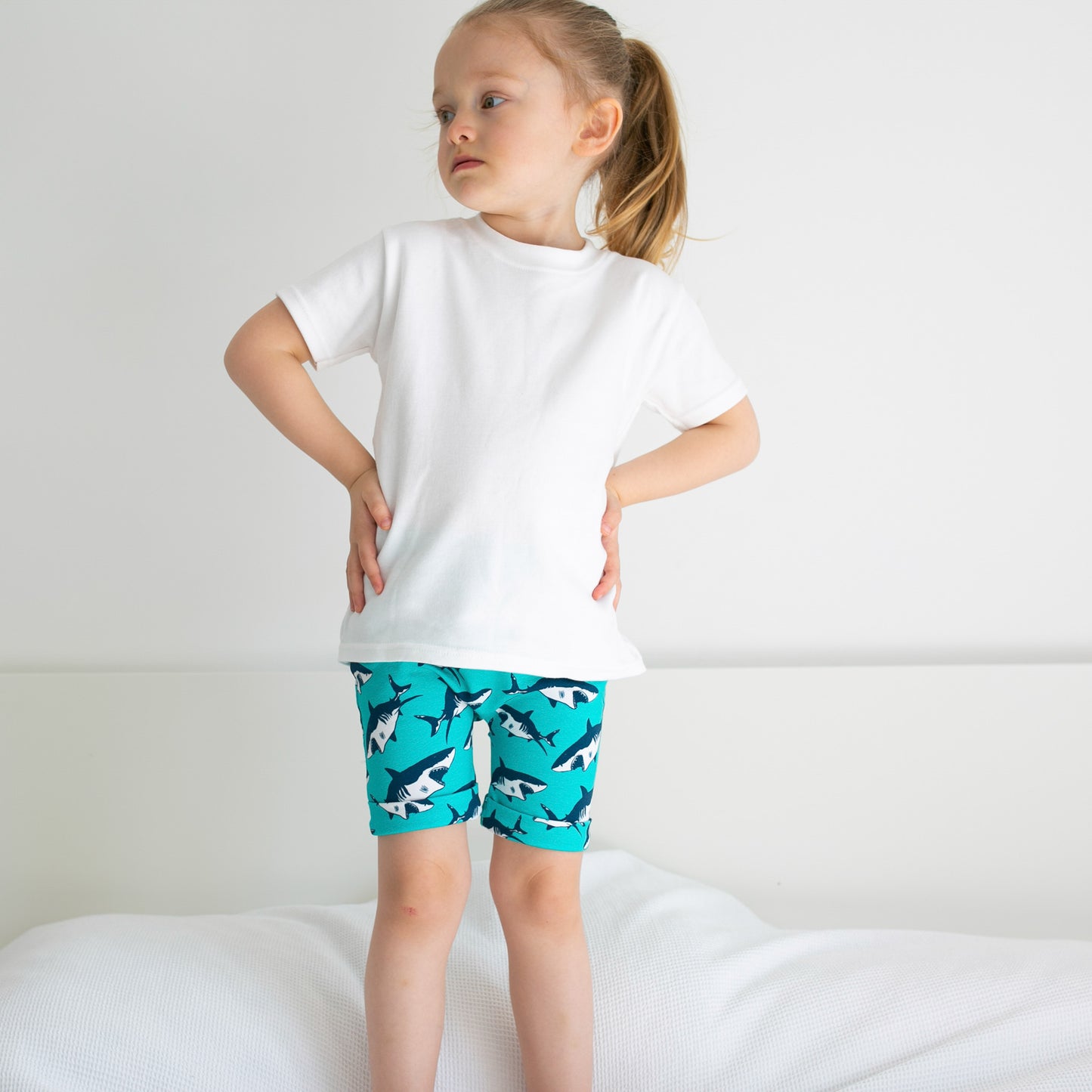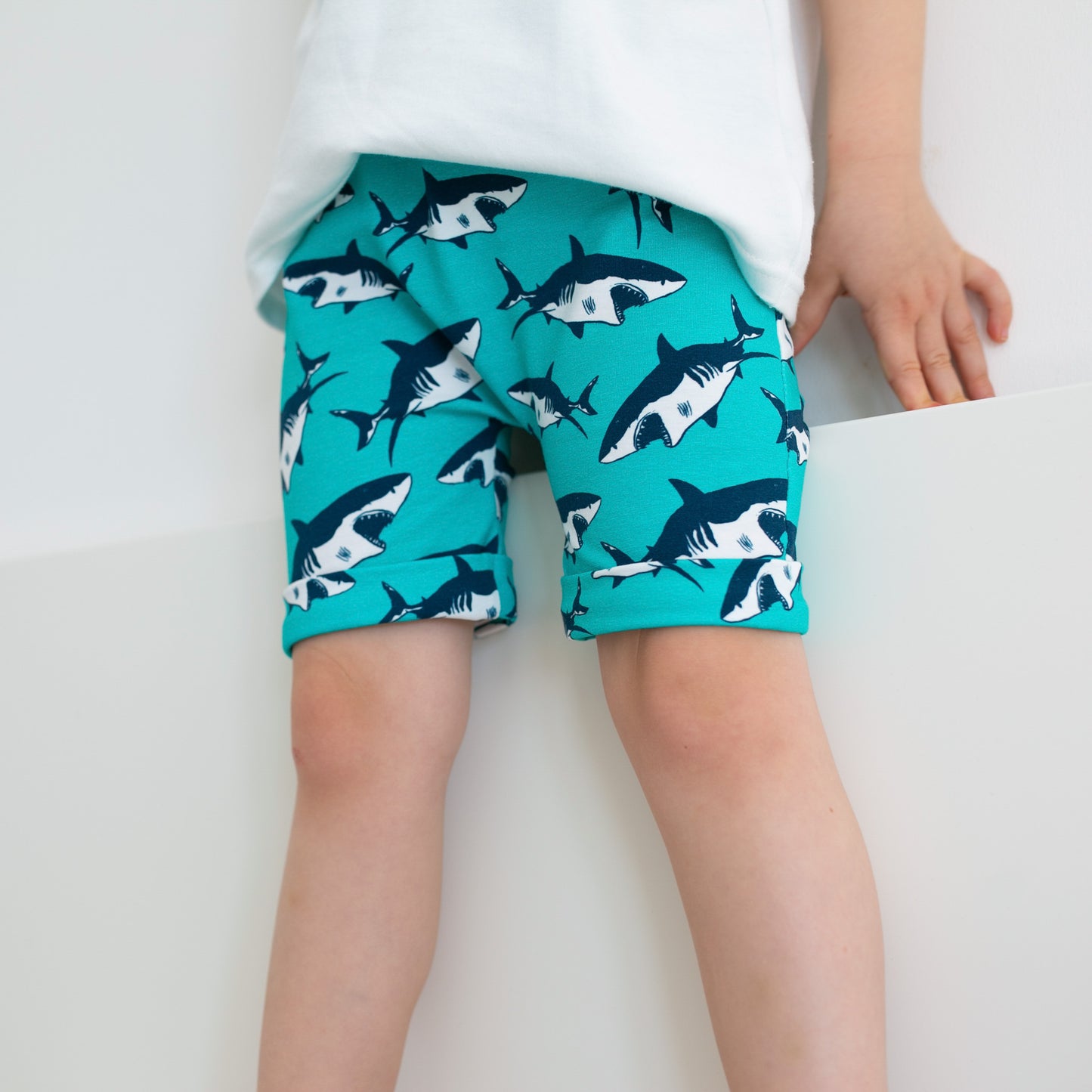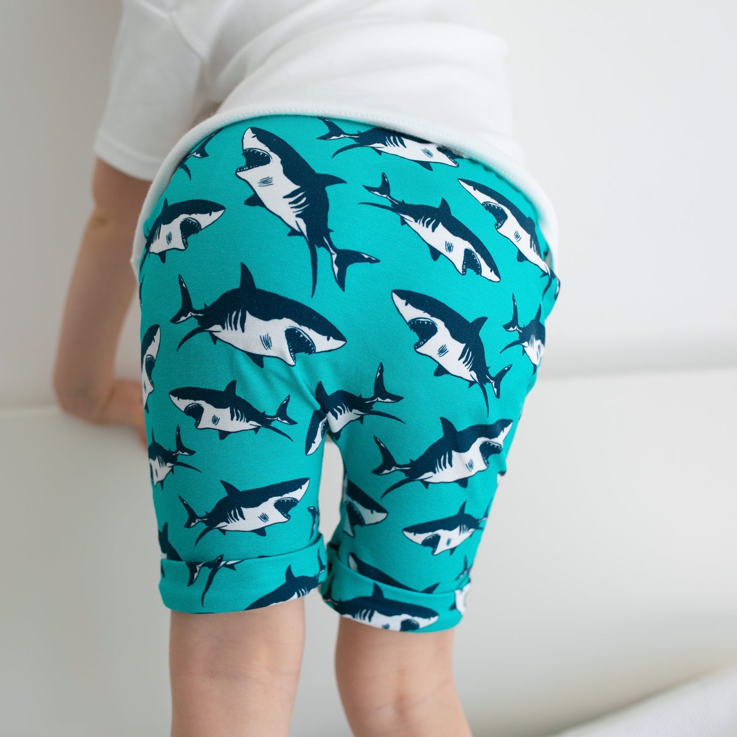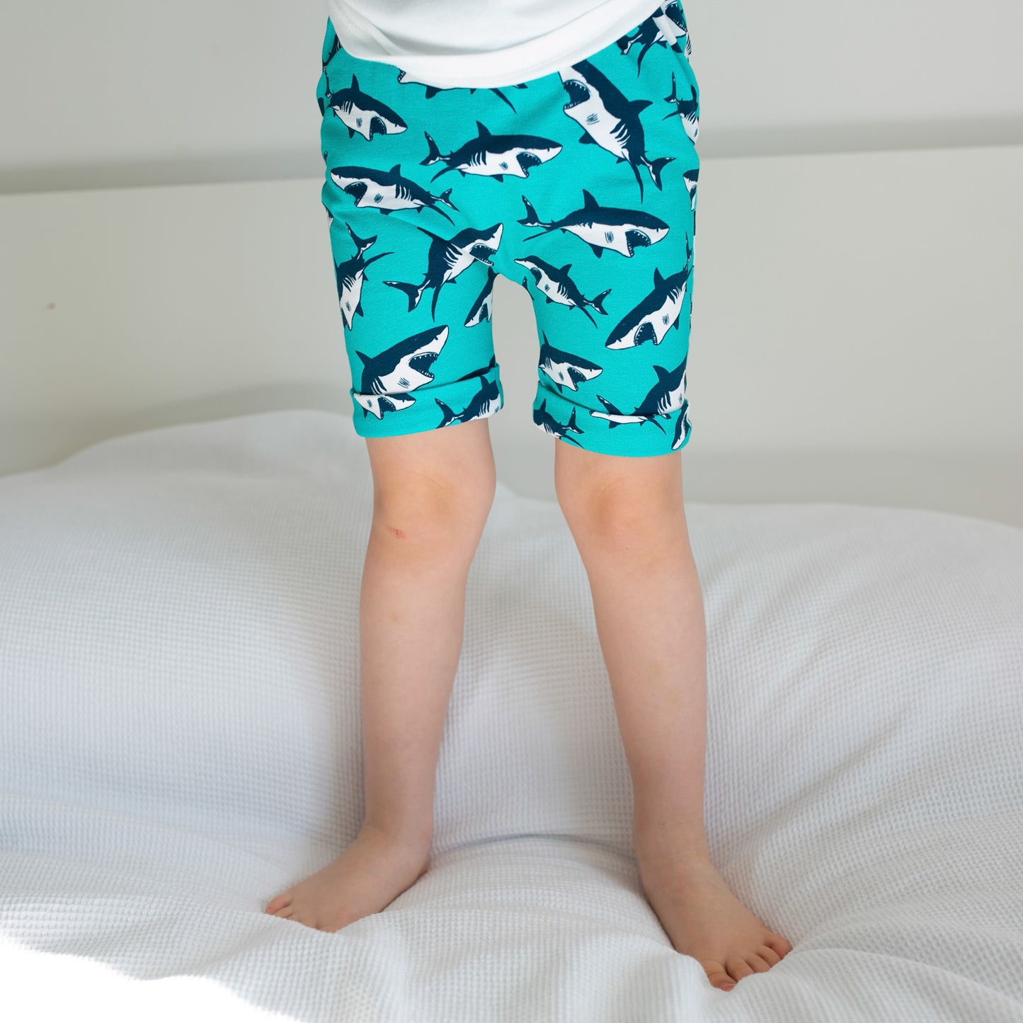 Our shark print Shorts are made in the UK from 95% Cotton 5 % Elastane Jersey.