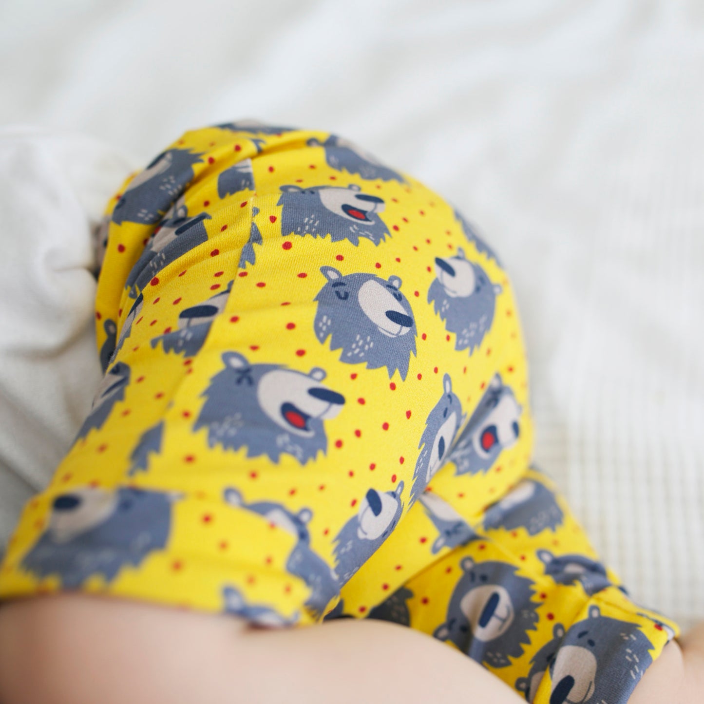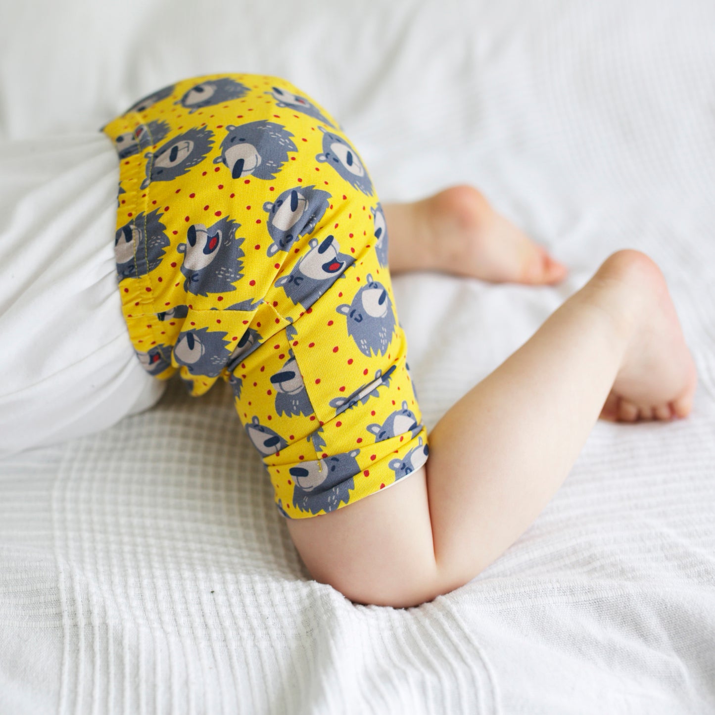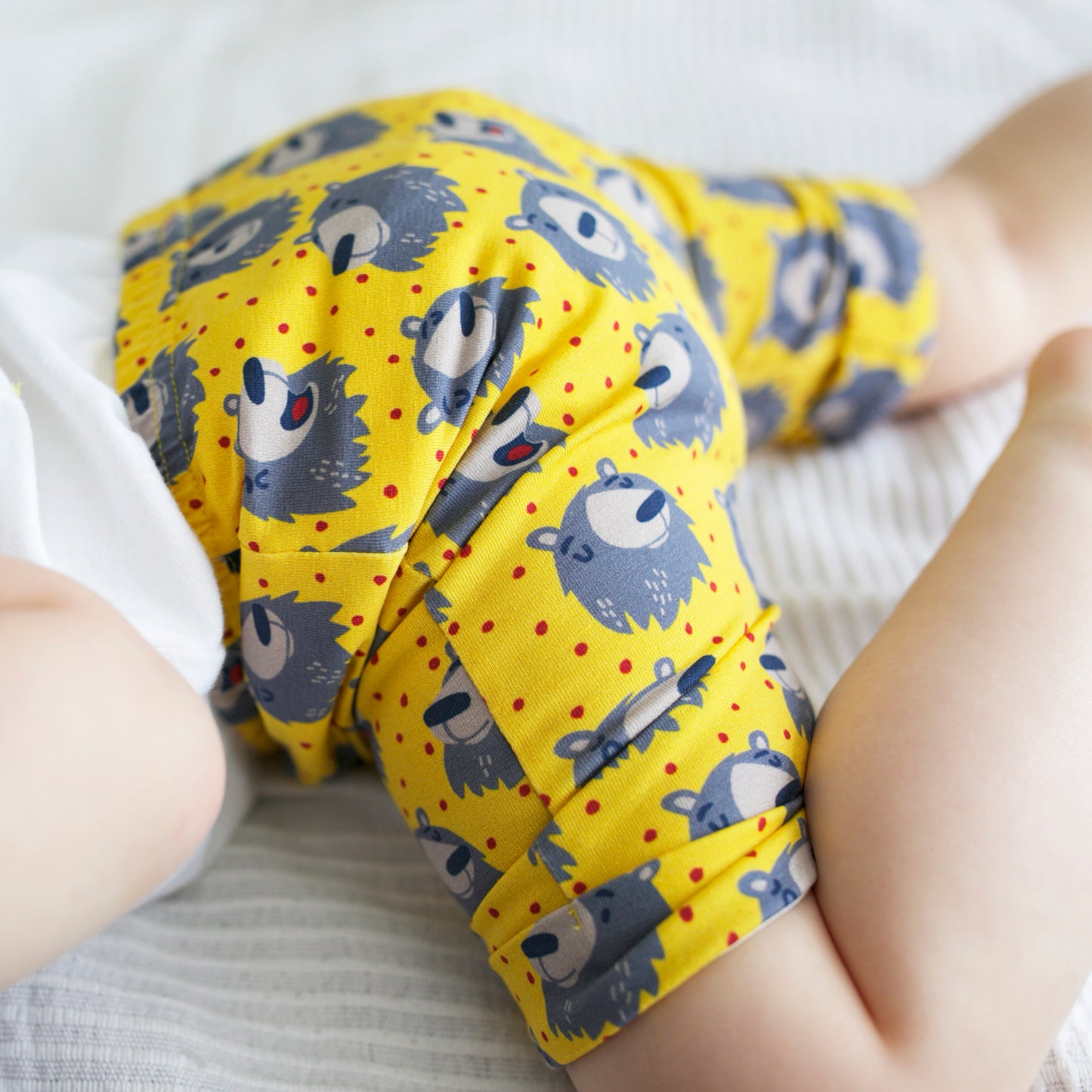 Our Bear print Shorts are made in the UK from 95% Cotton 5 % Elastane Jersey.