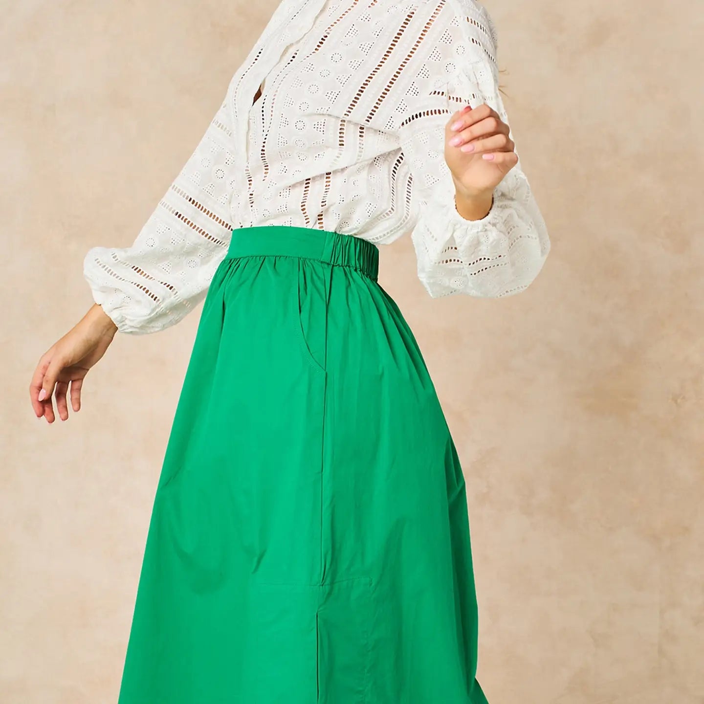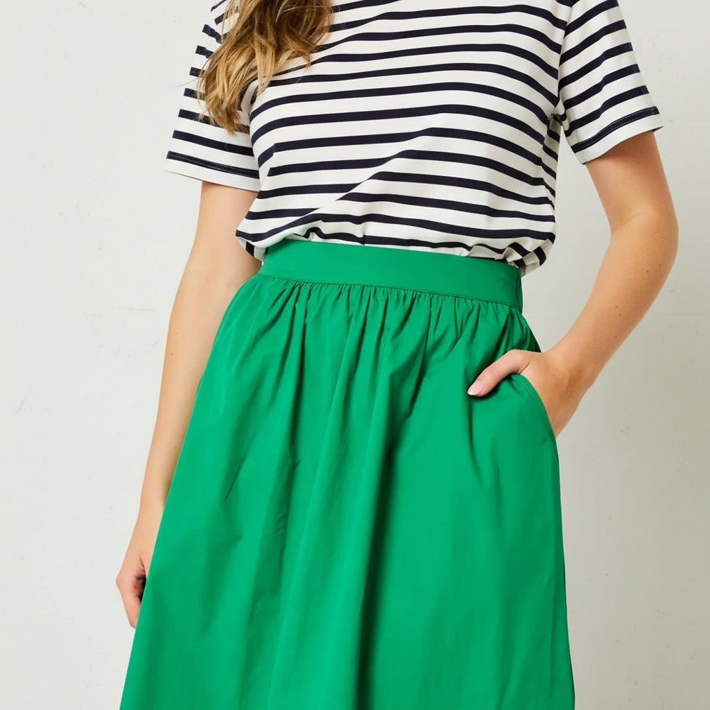 A timeless silhouette in the most uplifting shade of green. This beautifully cut midi skirt is crafted from 100% breathable cotton, offering structure while remaining lightweight and comfortable to wear all day.