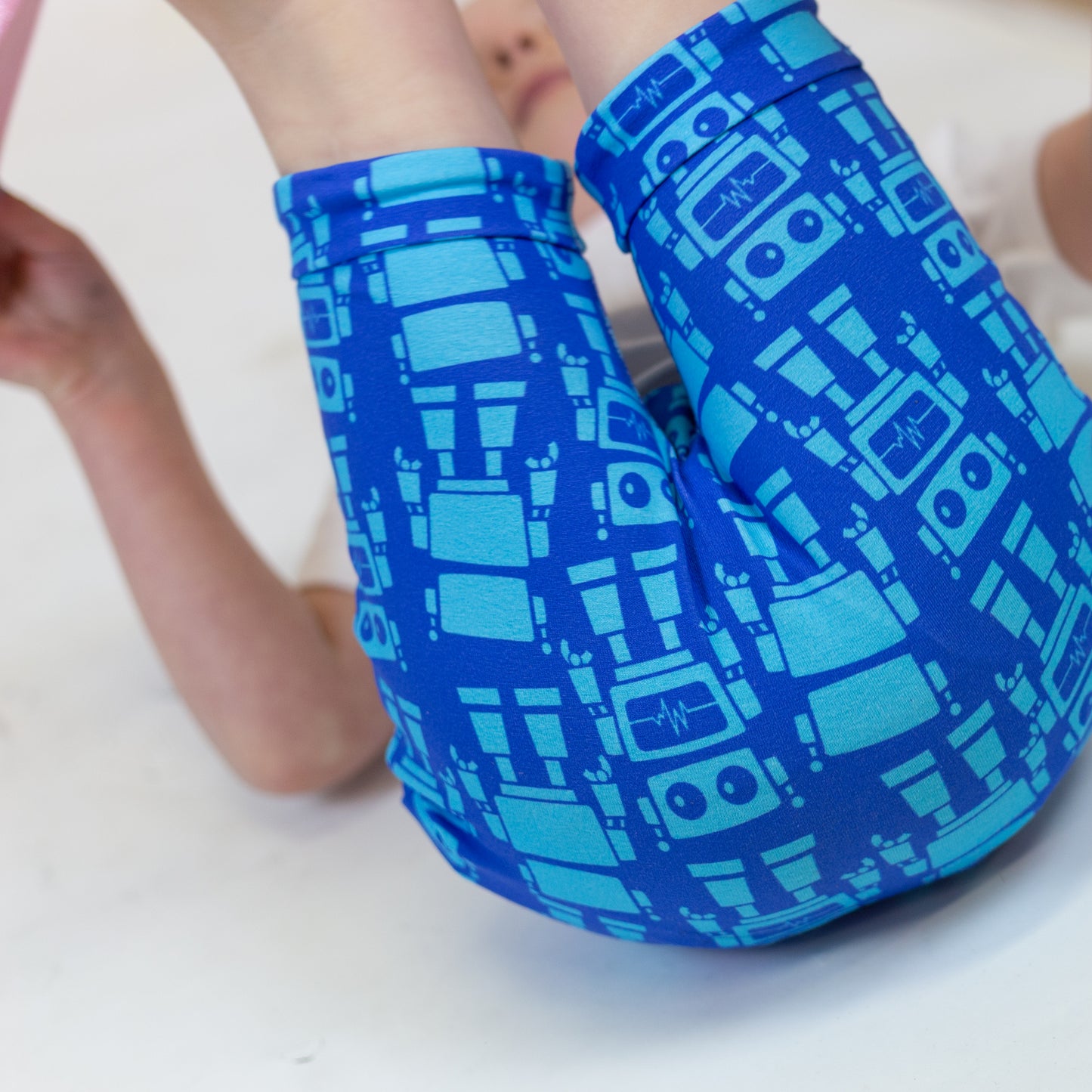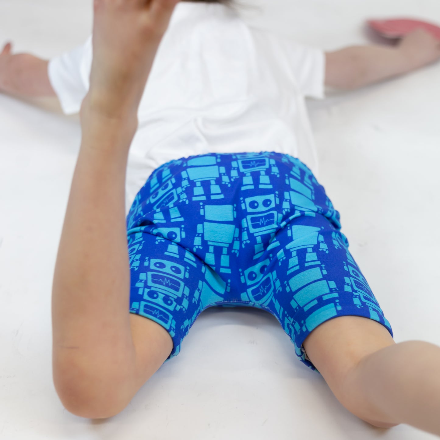 Our Robot print Shorts are made in the UK from 95% Cotton 5 % Elastane Jersey.
