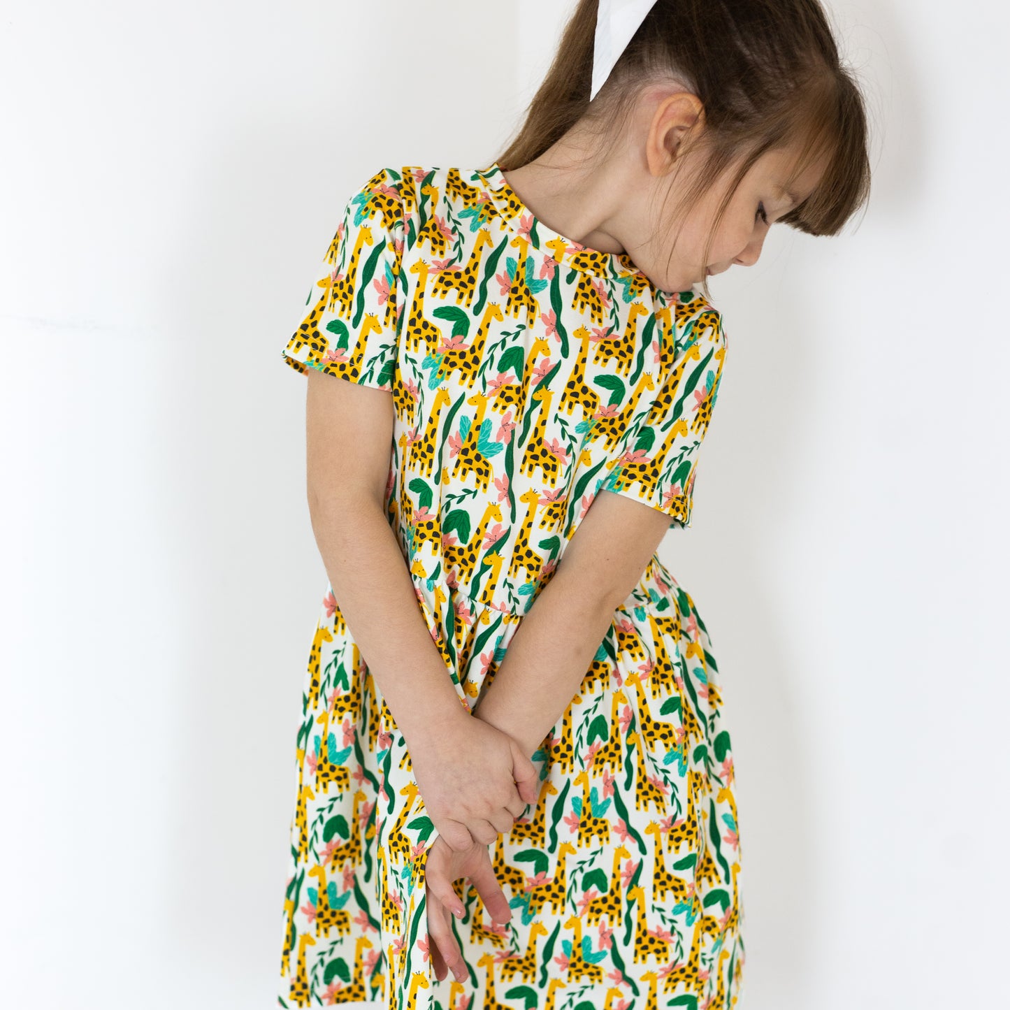 Our new Giraffe print Dress is made in the UK from 95% Cotton and 5 % Elastane Jersey.