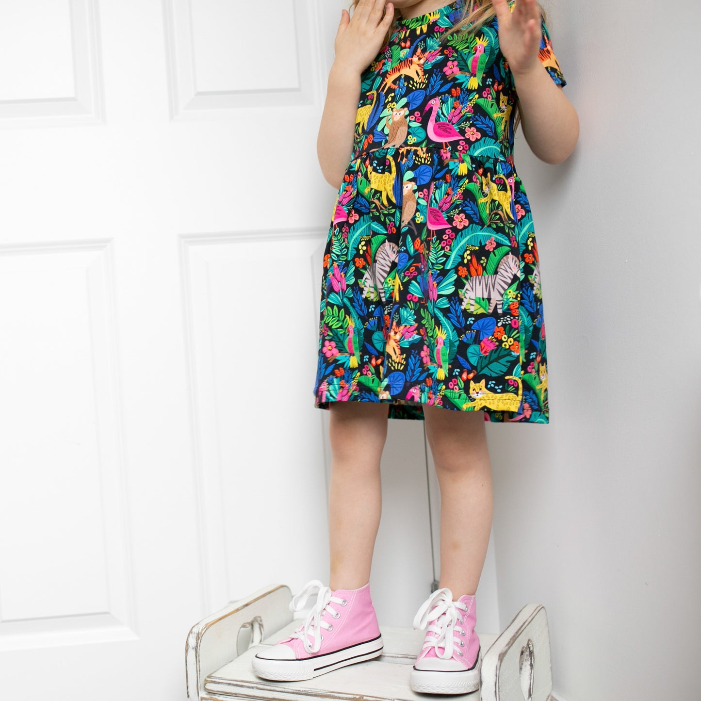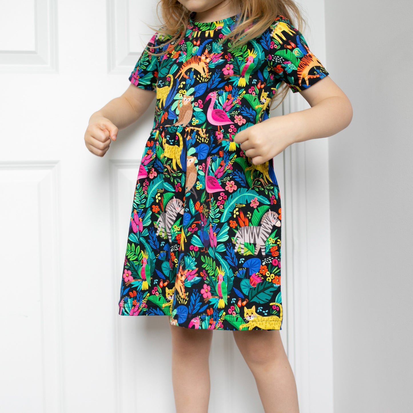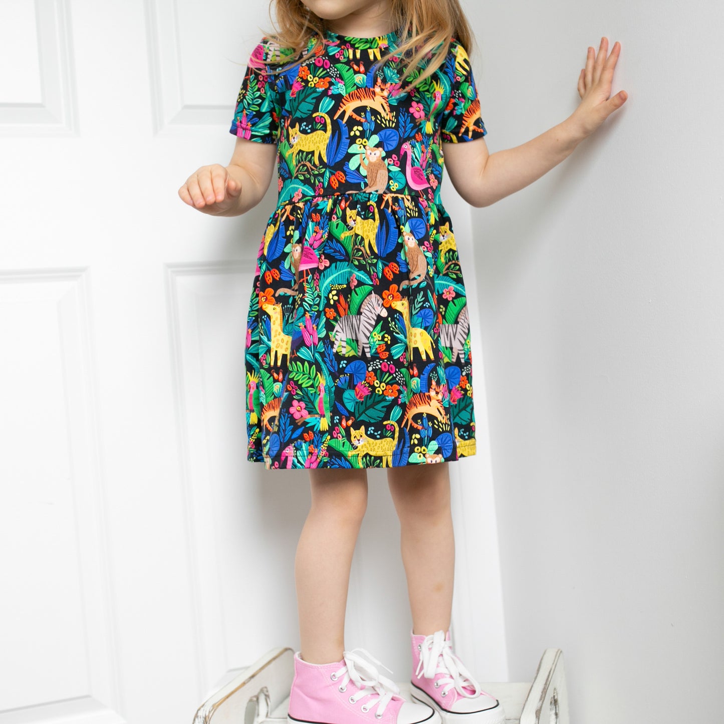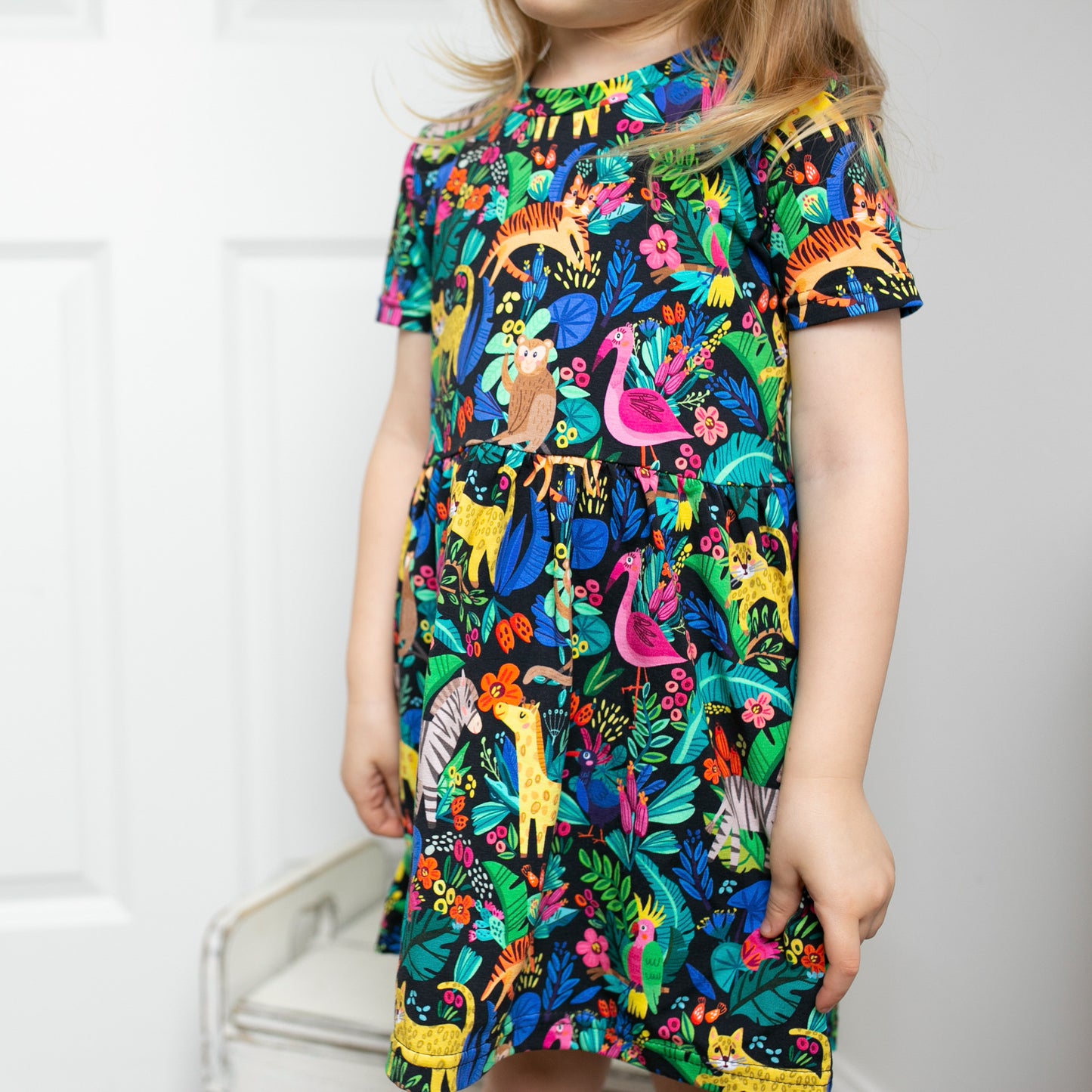 Our Jazzy Jungle Dress is made in the UK from 95% Cotton and 5 % Elastane Jersey.