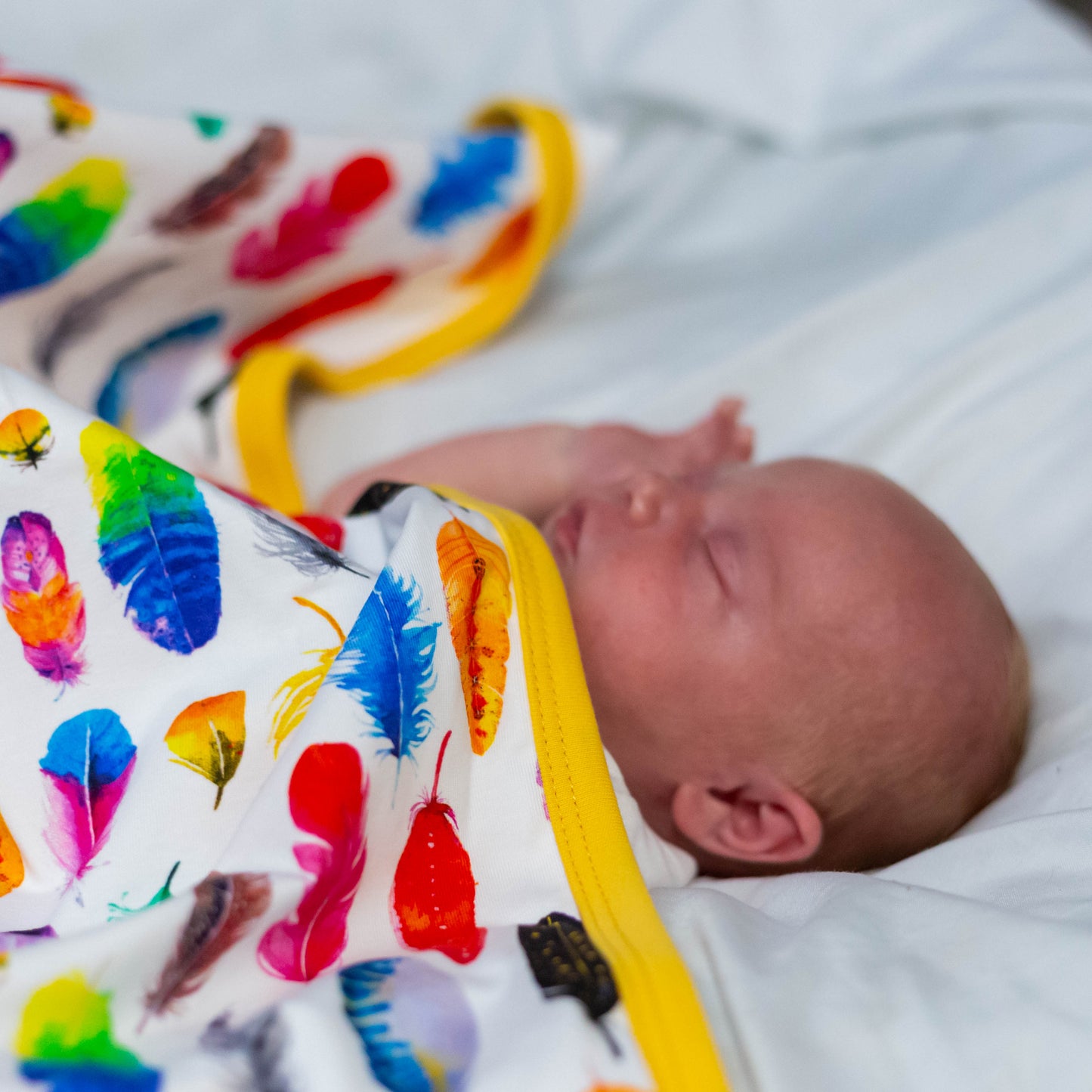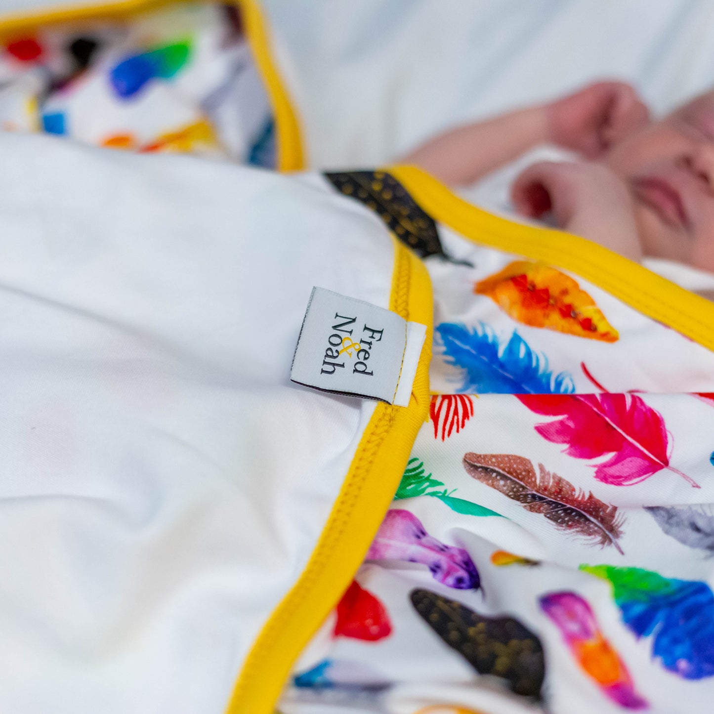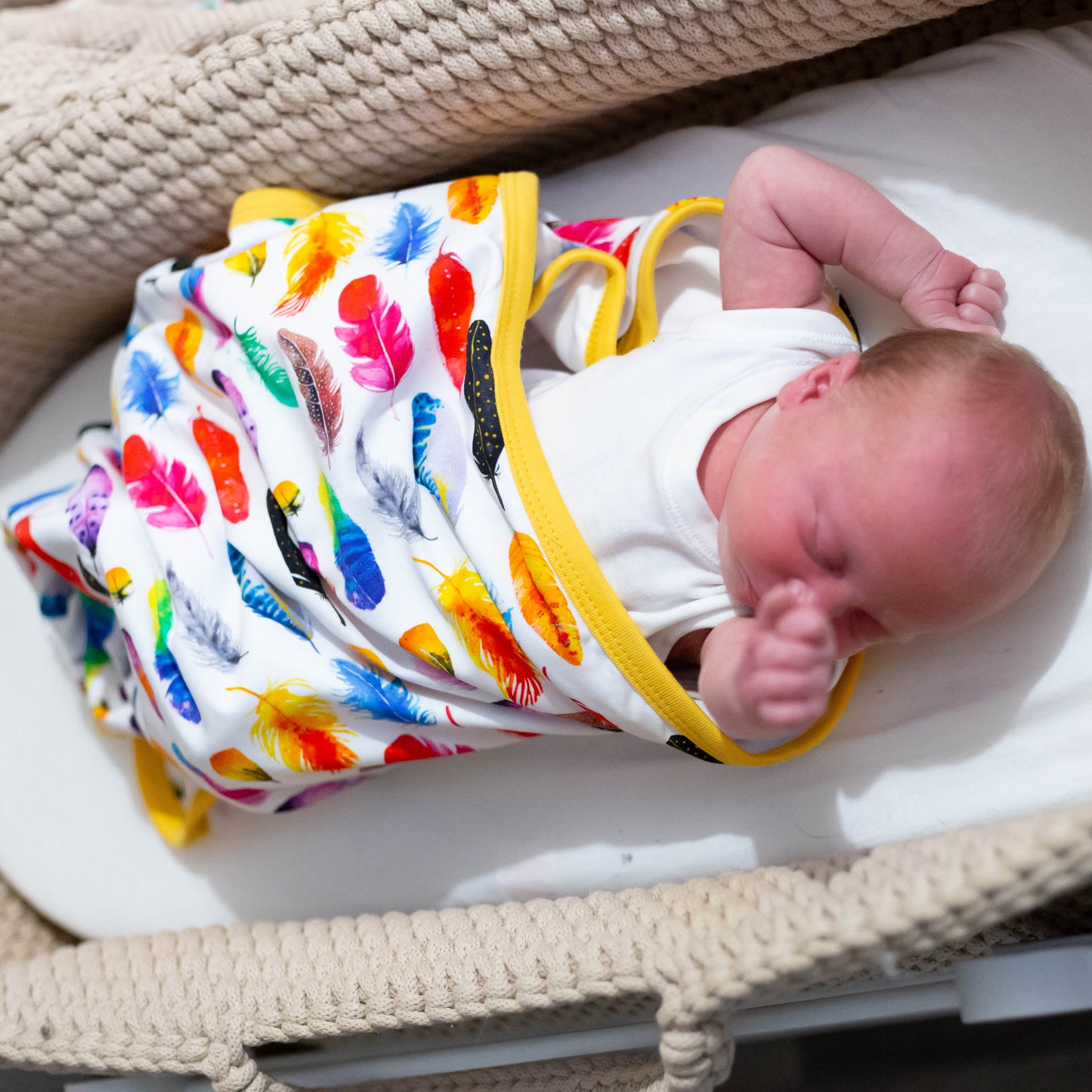 The top layer features our cheerful rainbow feather print on a smooth cotton jersey blend, while the reverse is a plain turquoise cotton for a fresh, modern finish. Perfect for prams, pushchairs, or cosy naps at home.