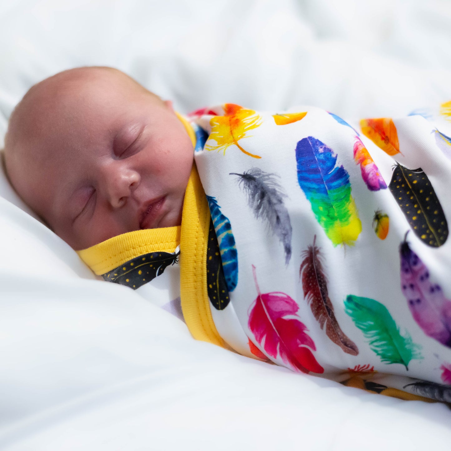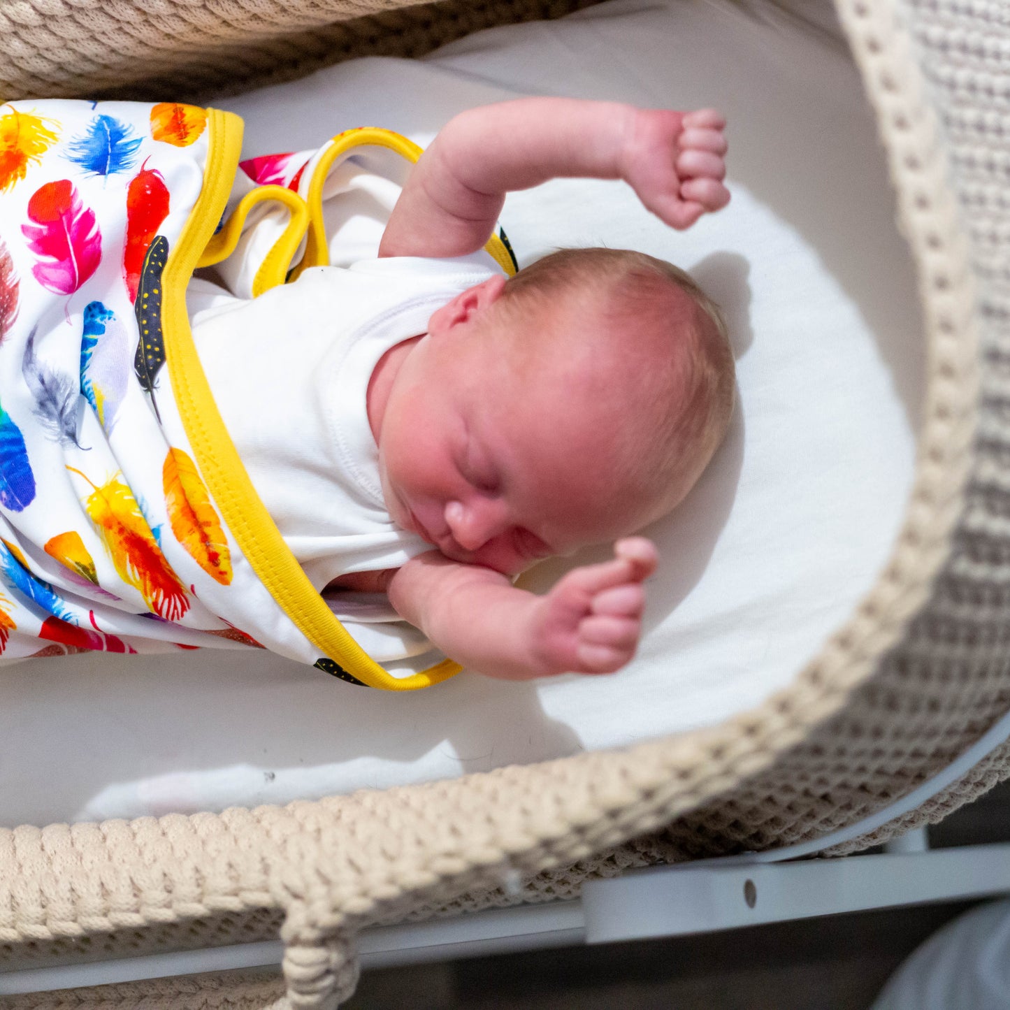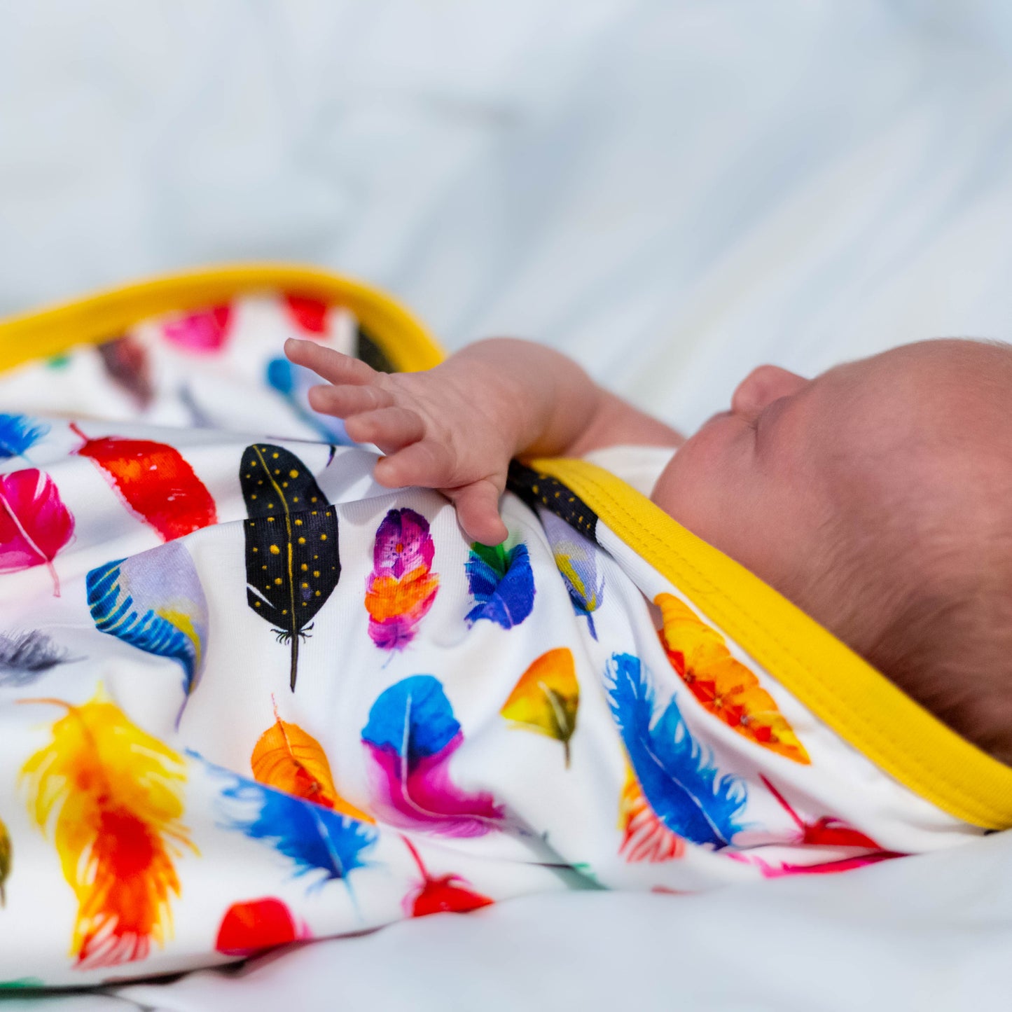 The top layer features our cheerful rainbow feather print on a smooth cotton jersey blend, while the reverse is a plain turquoise cotton for a fresh, modern finish. Perfect for prams, pushchairs, or cosy naps at home.