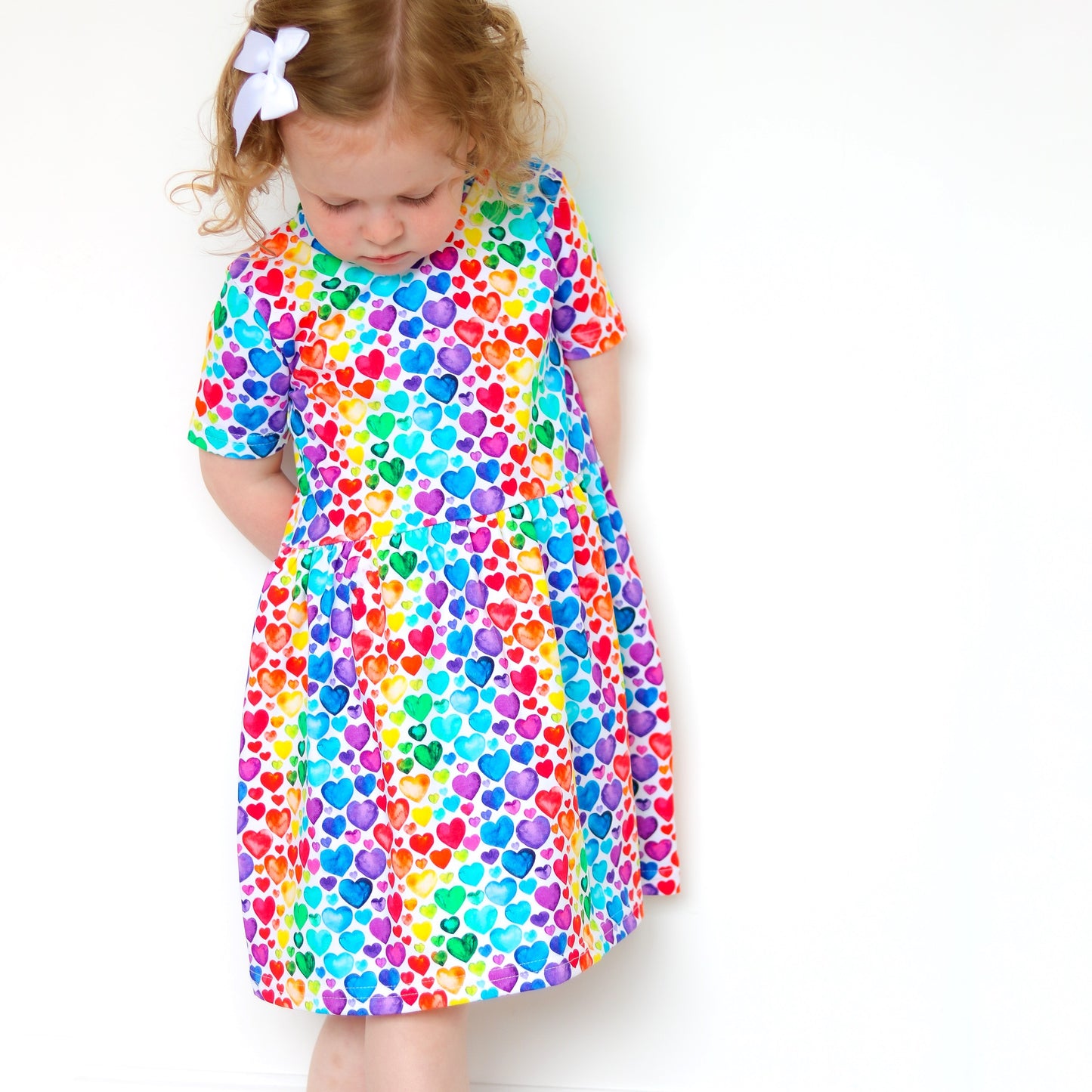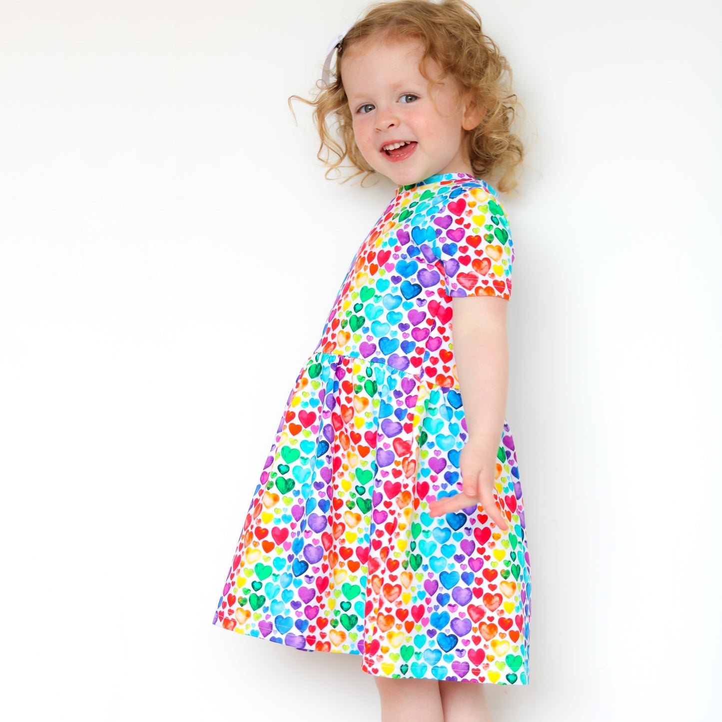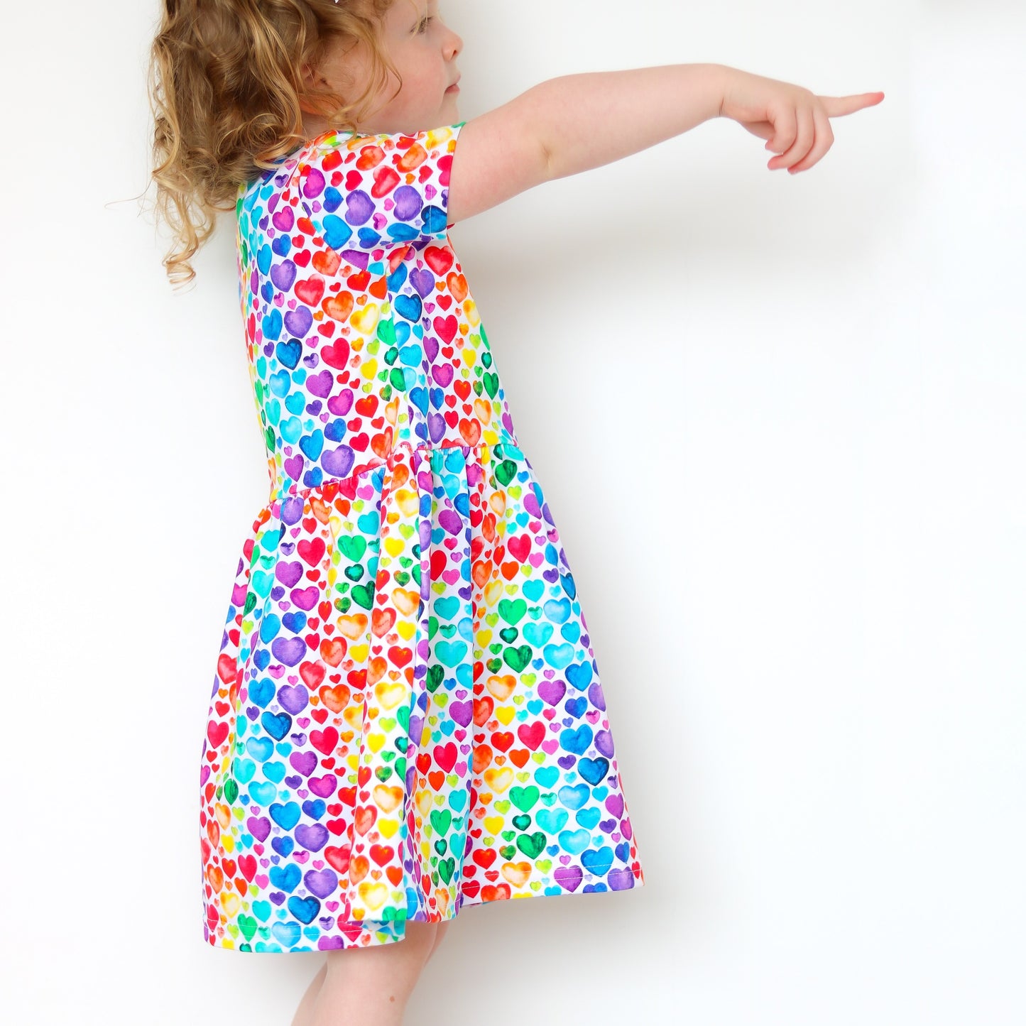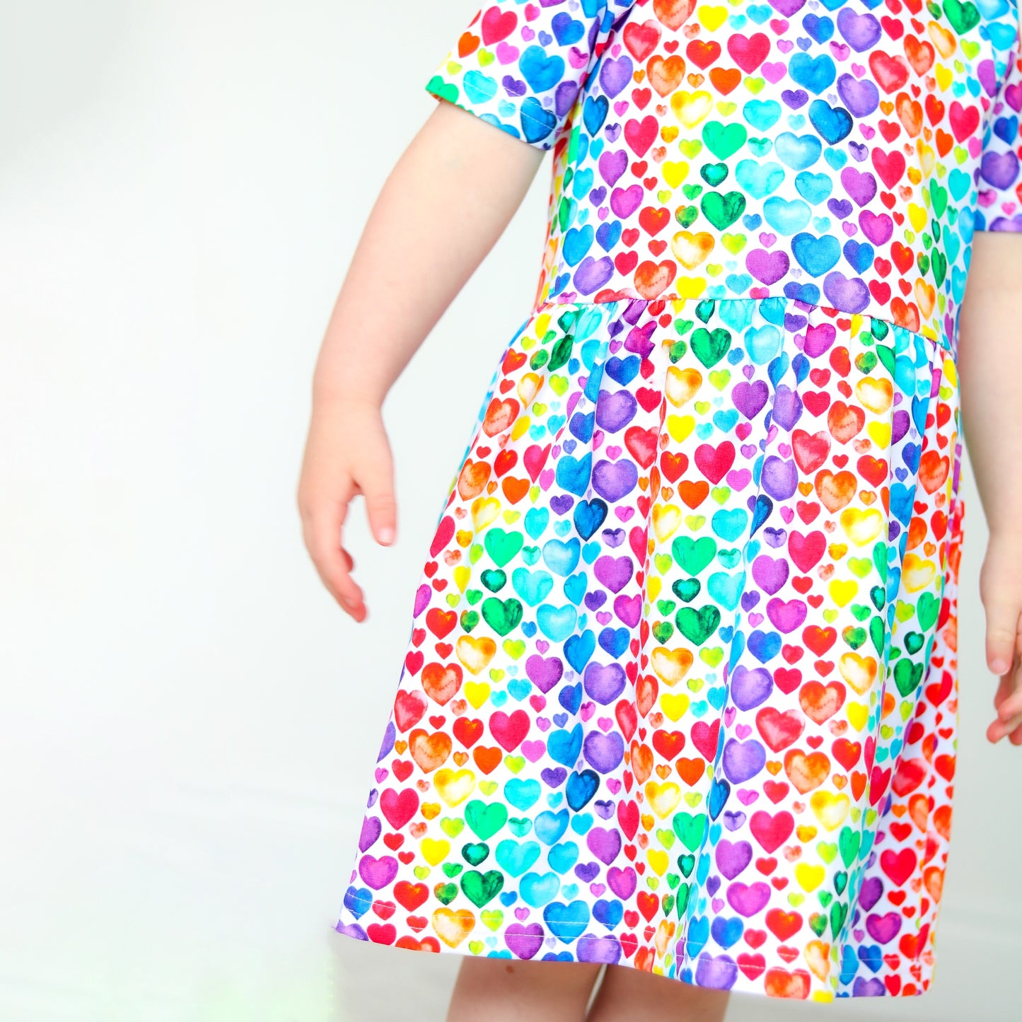 Our new Rainbow heart Dress is made in the UK from 95% Cotton 5 % Elastane Jersey.