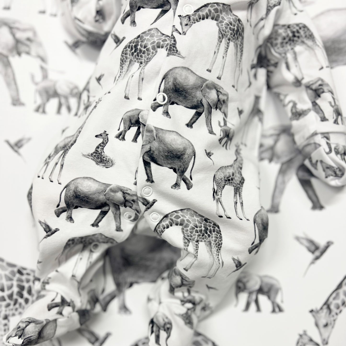 Our new and gorgeous Safari print sleep suit is the perfect one-piece for any baby.