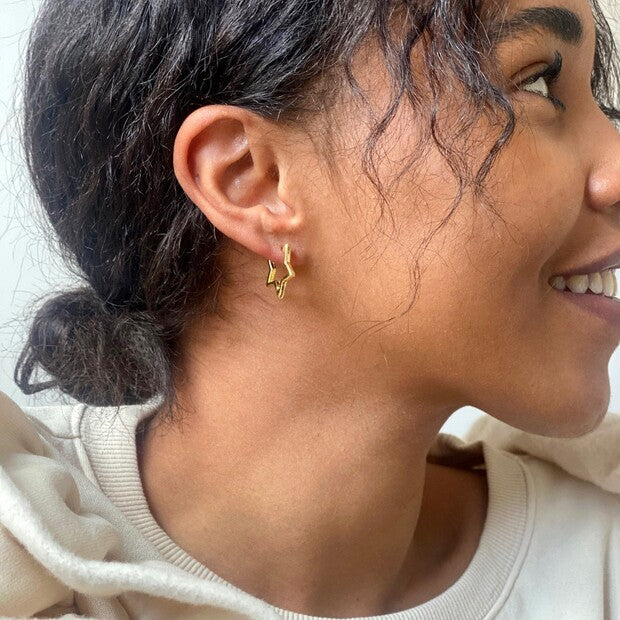A pair of ladies' hoop earrings shaped like stars, wonderful for adding a golden finishing touch to your look. Made from 18ct gold plated brass, these earrings open by pulling them gently apart at the top, opening them via the hinge at the bottom to reveal the 18ct gold sterling silver posts.